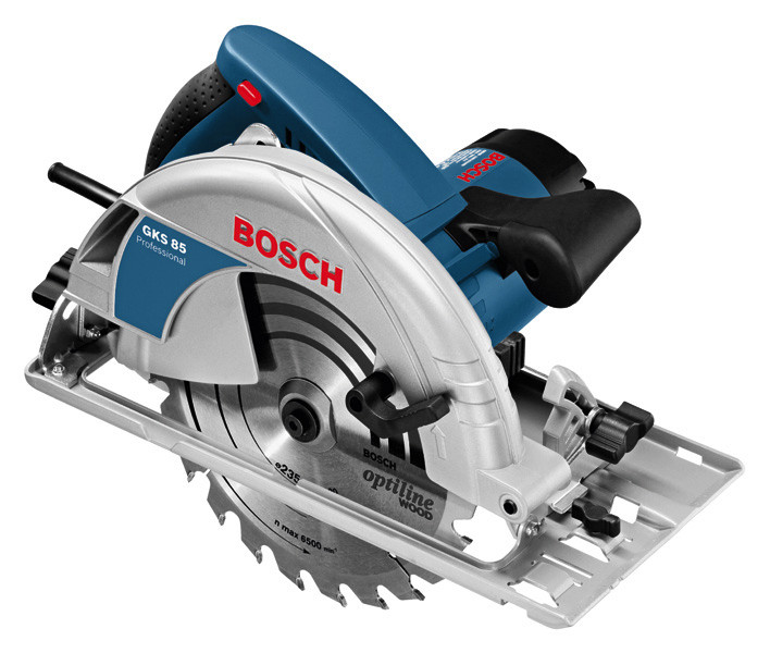 Handkreissäge GKS 85, Hochleistung für Schnitte bis 85 mm – in diesem Bereich überzeugt die GKS 85 Professional. Die Kreissäge ist mit einem 2.200-W-Motor ausgestattet, der das Sägen von Massivholzbalken mit einer Schnitttiefe bis 85 mm ermöglicht. Die Säge ist dank einer gestanzten Metallgrundplatte und einer geschlossenen Pendelschutzhaube aus Aluminiumdruckguss sehr robust. Die GKS 85 Professional ermöglicht mit ihrem optimierten Spanabweiser und dem Turbogebläse eine konstant bessere Sicht auf die Anrisslinie. Die GKS 85 Professional sägt verschiedene Materialien wie Massivholz und Holzwerkstoffe wie OSB, Sperrholz oder MDF. Sie ist mit Absaugstutzen, Sanftanlauf und Spindelarretierung ausgestattet. Absaugadapter (ET-Nr. 1 619 P01 627). Innensechskantschlüssel SW 5 (ET-Nr. 1 907 950 006). Parallelanschlag (1 608 190 007). 1 x Kreissägeblatt, Optiline Wood, 235 x 30/25 x 2,8 mm, 24 (2 608 640 725)