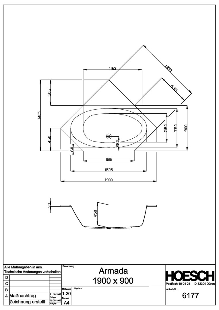 Hoesch 6-Eck-Badewanne Armada weiß, 190 x 90 cm, 170 l