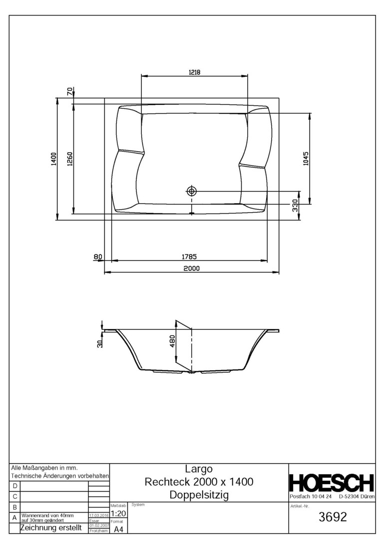 Hoesch Badewanne Largo 200 x 140 cm, weiß
