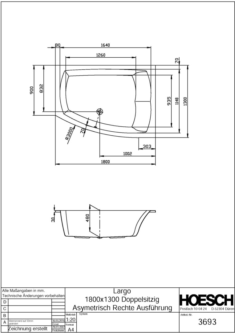 Hoesch Badewanne Largo asymetrisch 180x130cm, rechte Ausführung, weiß