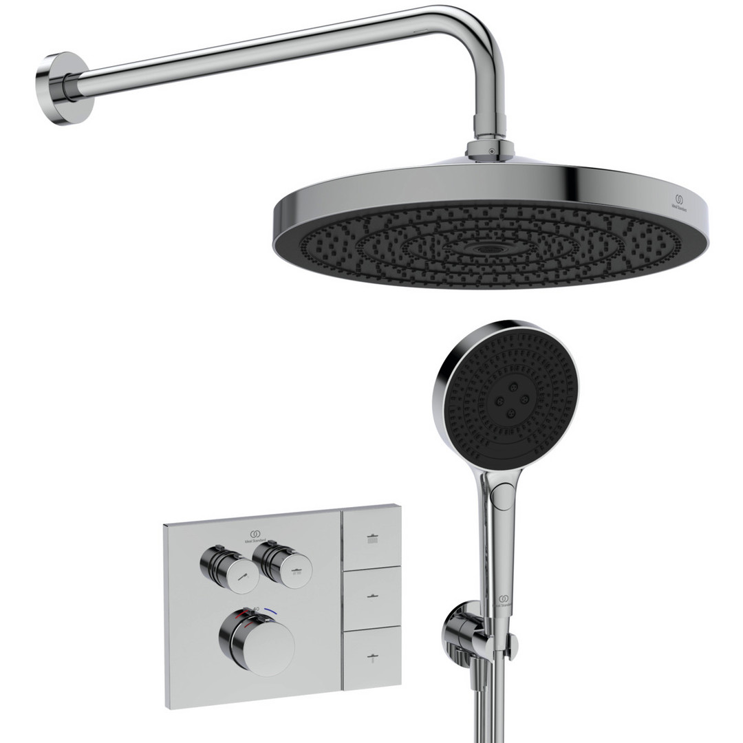 bestehend aus A7894.. - Brausethermostat Unterputz Bausatz 2 für Fertigmontage, mit optional montierbarem Rahmen für Solos Regenbrause-Fernbedienung, zwei Entnahmestellen, Rückflussverhinderer, Unterputz-Bausatz 1 zur Montage benötigt (A1000NU - separat erhältlich), Griff aus Metall, Rosette 213x157 mm, Thermostatkartusche mit Wachsdehnstoffelement, Heißwassertemperaturbegrenzer, Temperatursperre 40 °C, Heißwassertemperatureinstellung mit Verbrühschutz, DICHT-FIX System separate Abdichtung jeder Öffnung für optimalen Schutz des Bauwerks gegen Feuchtigkeit und Wasser, Geräuschverhalten DIN 4109 Gruppe 1, Lebensdauer DIN EN 200, DIN EN 1111, A7889.. - Regenbrause, 3-Funktion, Strahlarten Regen, sanfter Regen und Massage, Ø 300 mm, Kugelgelenk, EasyClean, Anschluss G 1/2, Strahlartenumstellung per Fernbedienung (im Lieferumfang enthalten), Batteriebetrieb (6 V), Gewicht 1,940 kg, B9445.. - Wandanschluss, Anschluss G 1/2, Gewicht 0,473 kg, A7896.. - Solos Handbrause, 3-Funktion, Strahlarten Regen, Massage und sanfter Regen, Ø 130 mm, Navigo Druckknopfumschaltung, EasyClean, Anschluss G 1/2, Gewicht 0,700 kg, BC807.. - Wandanschlussbogen Unterputz, mit Brausehalter, Rückflussverhinderer, DVGW-eigensicher, Brauseschlauchanschluss G 1/2, Wandanschluss G 1/2, Gewicht 0,187 kg, BE175.. - Brauseschlauch, Idealflex, Anschluss G 1/2