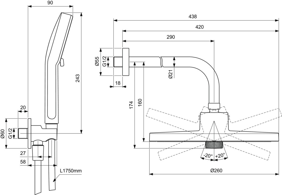 bestehend aus BD581.. - Regenbrause, 2-Funktion, Strahlarten sanfter Regen und Regen, Ø 260 mm, Drehumschaltung, Kugelgelenk, EasyClean, Anschluss G1/2, Gewicht 1,290 kg, B9444.. - Wandanschluss, Anschluss G1/2, Gewicht 0,298 kg, BD580.. - Handbrause, 2-Funktion, Strahlarten Massage und sanfter Regen, Ø 100 mm, Drehumschaltung, EasyClean, Anschluss G1/2, Gewicht 0,231 kg, BC807.. - Wandanschlussbogen Unterputz, mit Brausehalter, Rückflussverhinderer, DVGW-Eigensicher, Brauseschlauchanschluss G1/2, Wandanschluss G1/2, Gewicht 0,187 kg, BE175.. - Brauseschlauch, Idealflex, Anschluss G1/2