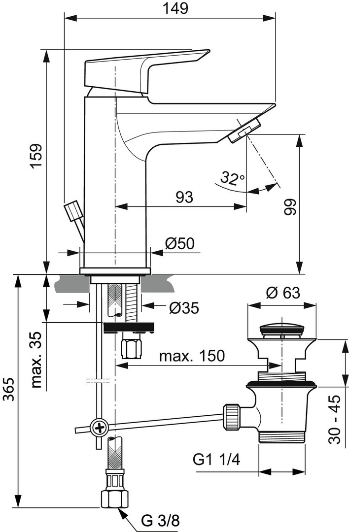DN 15, Ausladung 93 mm, Auslaufhöhe 99 mm, Luftsprudler (sichtbar), Metall-Zugknopf-Ablaufgarnitur G 1 1/4, flexible Anschlussschläuche G 3/8, Griff aus Metall mit Rot-/Blau-Markierung, Schnellmontagesystem, Kartusche Ø 28 mm, Kartusche mit keramischen Dichtscheiben, Kartuschenschwenkbereich 100°, Heißwassertemperaturbegrenzer, Norm DIN EN 248, Geräuschverhalten DIN 4109 Gruppe 1, Lebensdauer DIN EN 817, DIN EN 200