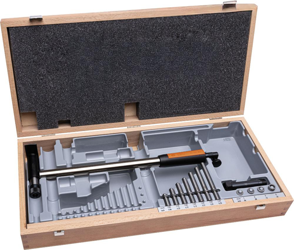 Lieferung: Mit Halter, festen Messbolzen, Messscheiben und Werks-Kalibrierschein, im Holzkasten.