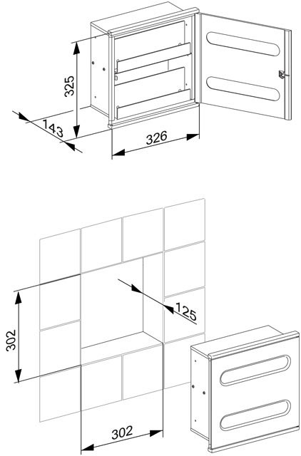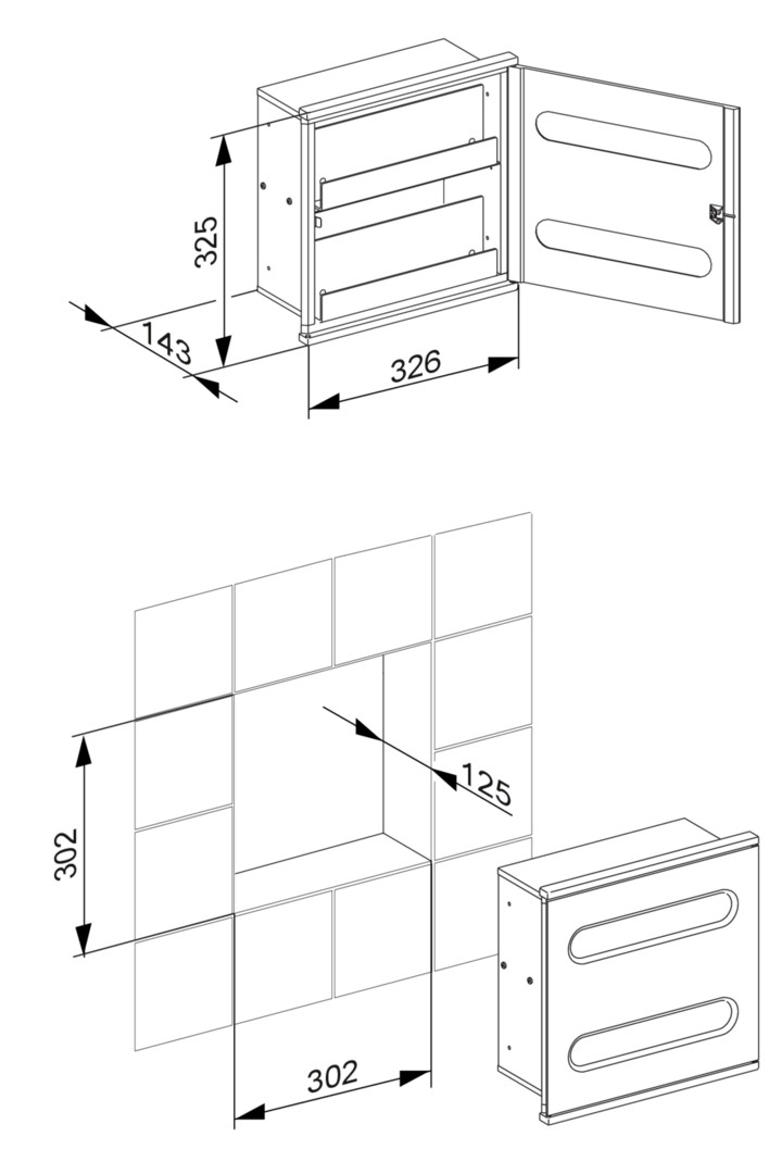 Wandmontage Unterputz, für gefalzte Papiertücher (z-Faltung) geeignet (250 x 230 mm), Betätigung von vorne, Befüllung durch abschließbare Fronttür, Einbaukorpus aus verzinktem Stahlblech, Einbautiefe 125 mm, verdeckte Befestigung, mit Befestigungs-Set