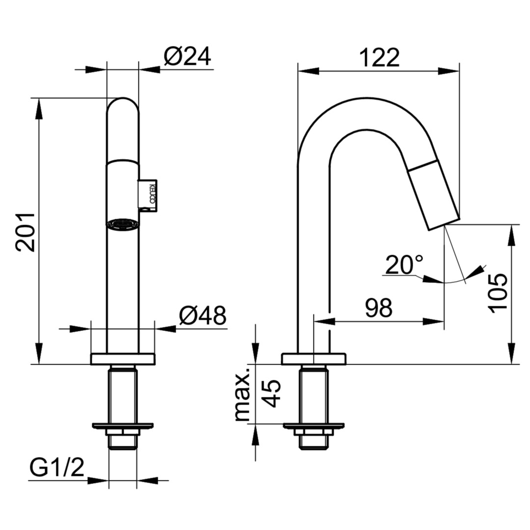 für Kaltwasser oder vorgemischtes Wasser, Ausladung 100 mm, Einlochmontage mit Schnell-Montage-System, Anschlussgewinde G 1/2, Absperrventil mit keramischen Dichtscheiben, Luftsprudler M 21,5 x 1, Durchflussmenge begrenzt auf 5 l/min, für Durchlauferhitzer geeignet