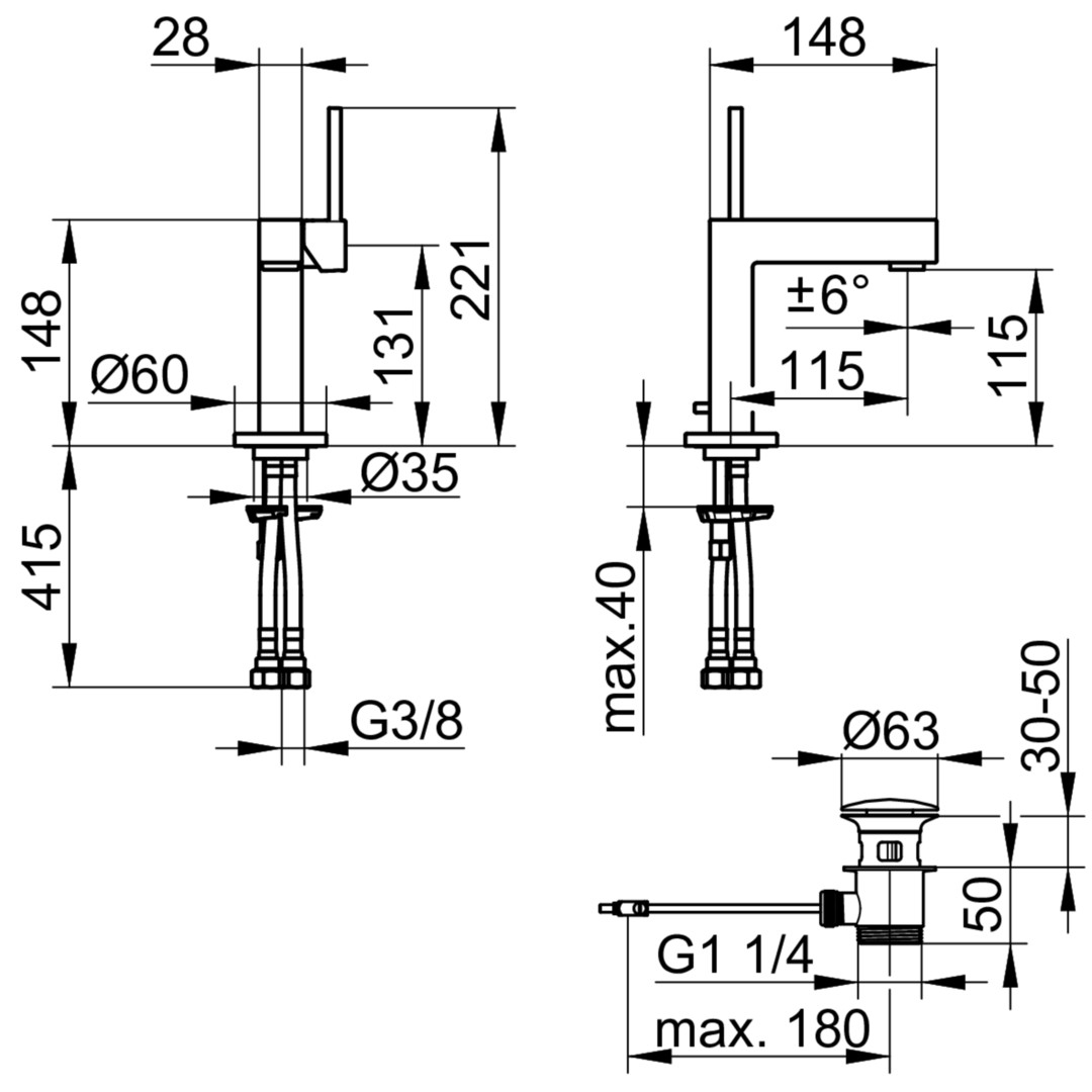 Auslaufhöhe 115 mm, Einlochmontage mit Schnell-Montage-System, Anschlussart Anschlussschläuche G 3/8, Mischwasserkartusche mit keramischen Dichtscheiben, Luftsprudler M 24x1, Strahlwinkel +/- 6° verstellbar, Durchflussmenge begrenzt auf 7,6 l/min, für Durchlauferhitzer geeignet, geräuschgeprüft