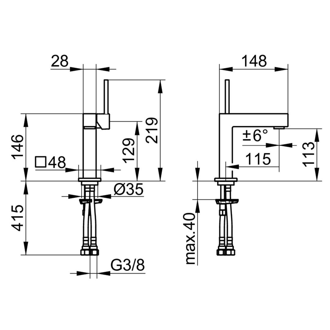 Auslaufhöhe 113 mm, Einlochmontage mit Schnell-Montage-System, Anschlussart: Anschlussschläuche G 3/8, Mischwasserkartusche mit keramischen Dichtscheiben, Luftsprudler M 24x1, Strahlwinkel +/- 6° verstellbar, Durchflussmenge begrenzt auf 7,6 l/min, für Durchlauferhitzer geeignet, geräuschgeprüft