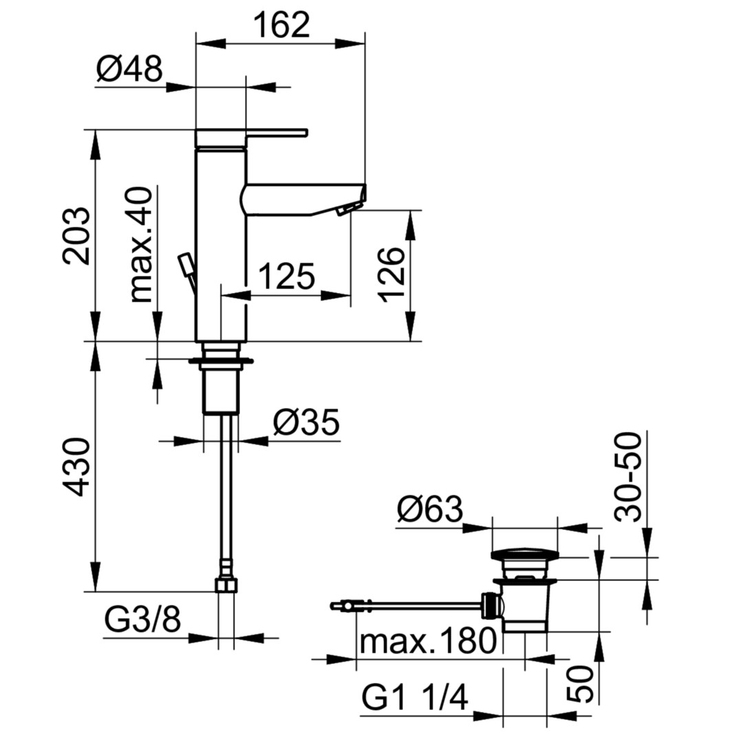 Auslaufhöhe 126 mm, Zugstangen-Ablaufgarnitur, Einlochmontage mit Schnell-Montage-System, Anschlussart Anschlussschläuche G 3/8, Mischwasserkartusche mit keramischen Dichtscheiben, mit Temperaturbegrenzung, Luftsprudler M 24x1, Strahlwinkel +/- 6° verstellbar, Durchflussmenge begrenzt auf 6 l/min, für Durchlauferhitzer geeignet, geräuschgeprüft