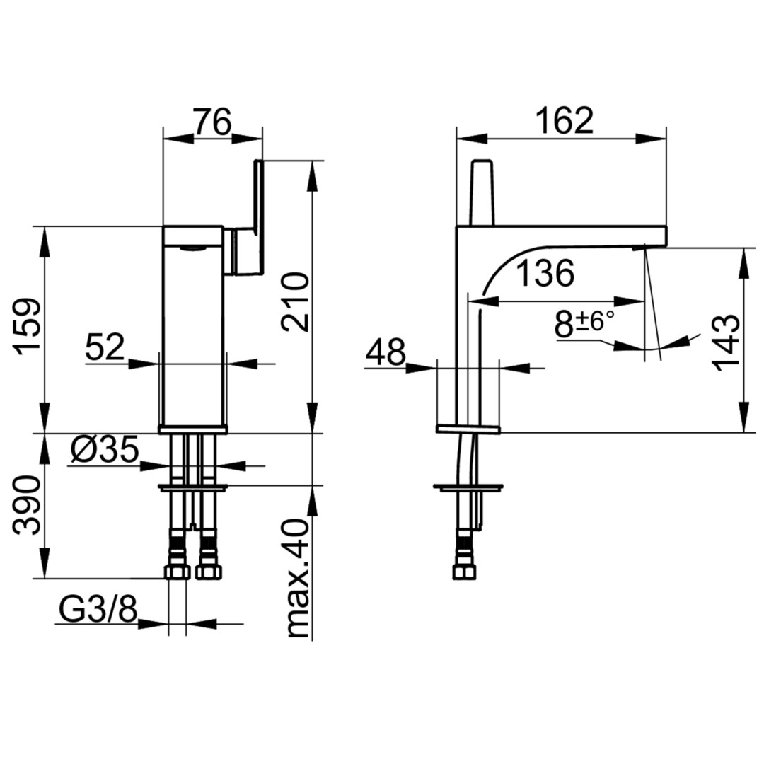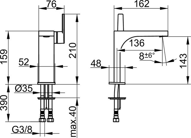 Auslaufhöhe 136 mm, Einlochmontage mit Schnell-Montage-System, Anschlussart: Anschlussschläuche G 3/8, Mischwasserkartusche mit keramischen Dichtscheiben, Luftsprudler M 24x1, Strahlwinkel +/- 6° verstellbar, Durchflussmenge begrenzt auf 7,6 l/min, für Durchlauferhitzer geeignet, geräuschgeprüft