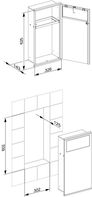 Wandmontage Unterputz, Fassungsvermögen 15 l, Betätigung von vorne, Einbaukorpus aus verzinktem Stahlblech, Einbautiefe 125 mm, verdeckte Befestigung, mit Befestigungs-Set