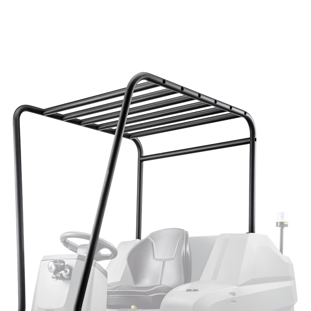Die sehr stabile Rohrkonstruktion des Schutzdachs für unsere Kehrsaugmaschine KM 100/120 R bietet dem Anwender höchstmöglichen Schutz vor herabfallenden Gegenständen. Insbesondere bei Reinigungseinsätzen in Hochregallagern empfiehlt sich diese präventive Sicherheitsmaßnahme, die selbstverständlich die gesetzlichen Vorgaben der Norm DIN EN 60335-2-72 erfüllt. Mit angebautem Schutzdach erhöht sich die Gesamthöhe der Kehrsaugmaschine auf insgesamt 2 Meter.