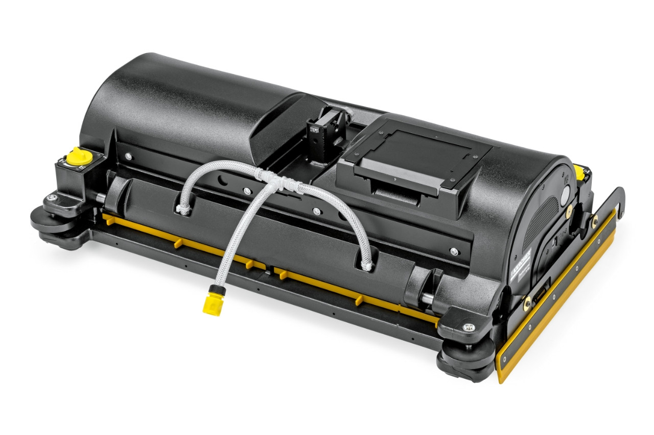 Bürstenkopf mit 2 Walzenbürsten und 120 cm Arbeitsbreite. Werkzeugloser Bürstenwechsel. Die Seitenschürzen sind höhenverstellbar und halten das Wasser unter dem Bürstenkopf. Die Reinigungsflotte wird so optimal dem Saugbalken zugeleitet, auch in Kurvenfahrten. Bürstenkopf separat verpackt.