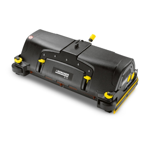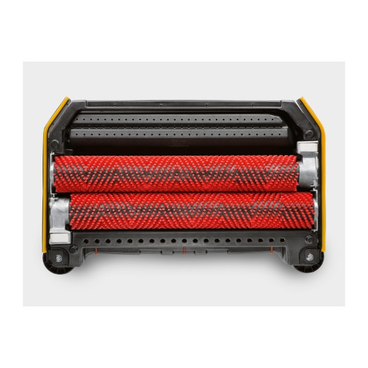 Bürstenkopf mit 2 Walzenbürsten und 75 cm Arbeitsbreite. Werkzeugloser Bürstenwechsel. Die Seitenschürzen sind höhenverstellbar und halten das Wasser unter dem Bürstenkopf. Die Reinigungsflotte wird so optimal dem Saugbalken zugeleitet, auch in Kurvenfahrten. Bürstenkopf separat verpackt.