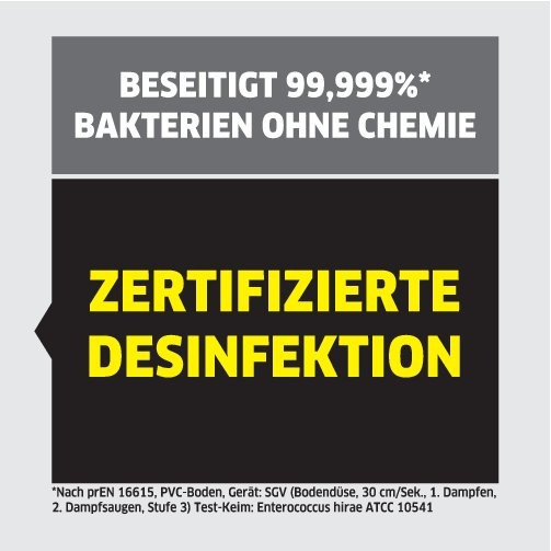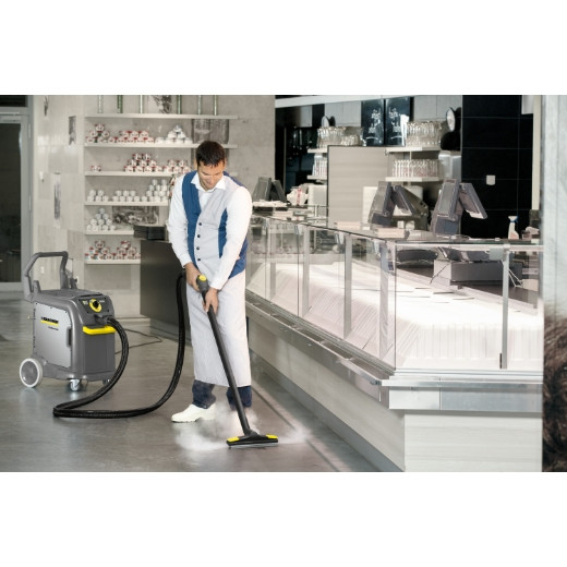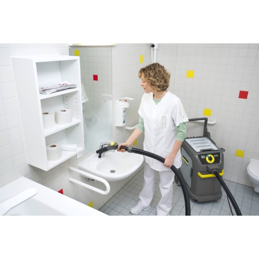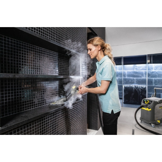 Der leicht bedienbare Dampfsauger SGV 8/5 überzeugt mit exzellenter Reinigungsleistung dank hohem Dampfdruck (8 bar), einer Heißwassertemperatur von circa 70 °C und einer 3-stufigen Dampfmengenregulierung. Die Reinigung erfolgt umweltschonend vollkommen ohne Chemie. Die praktische Selbstreinigungsfunktion des SGV 8/5 gewährleistet dauerhaft hygienische Reinheit. Zudem besticht das Gerät durch die besonders leichte und komfortable Bedienung wie beispielsweise über das Display zur Anzeige von Betriebszustand und Service-/Fehlermeldungen. Über den EASY-Operation-Drehschalter können die 7 Dampf-/Saugbetriebsarten einfach und schnell ausgewählt werden, und die ergonomische Dampf-/Saugpistole ermöglicht die flexible und direkte Steuerung von Dampfmenge, Spülbetrieb und Saugfunktion im laufenden Betrieb. Mit dem energieeffizienten und geräuschreduzierten eco!efficiency-Modus ist auch das Arbeiten in geräuschsensiblen Bereichen möglich. Das umfassende Zubehör wird schmutzgeschützt direkt am Gerät verstaut und ist somit ohne langes Suchen immer schnell griffbereit.