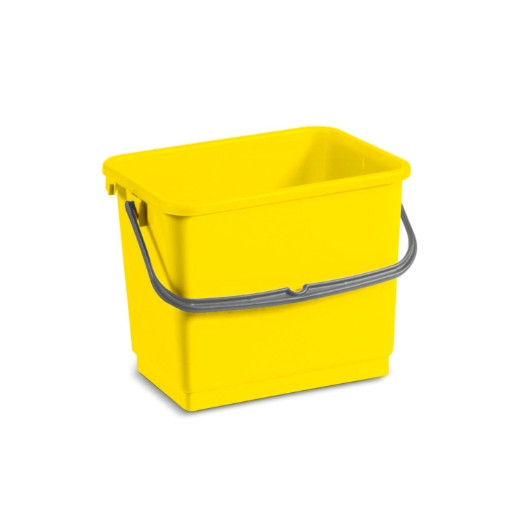 Gelber 4-Liter-Eimer mit farbcodiertem Reinigungssystem. Der Füllstand kann an Markierungen abgelesen werden. Anwendbar für alle Reinigungswagen.