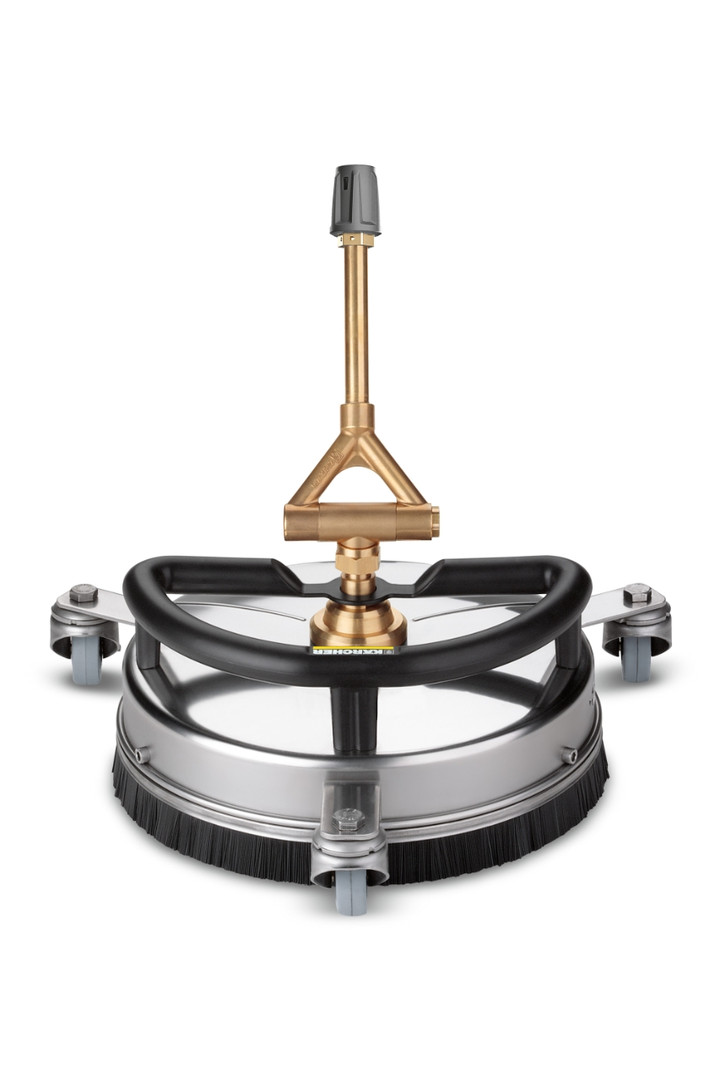 Hochwertiger, heißwasserbeständiger Flächenreiniger mit Edelstahlgehäuse. 2-fache Keramiklagerung, nicht zeichnende Lenkrollen, integrierter Saugschlauch-Anschluss für Absaugung des Spritzwassers. Bestens geeignet für die Innenreinigung und den Lebensmittelbereich. Gerätespezifisches Düsenkit muss separat bestellt werden. Max. 250 bar / 1300 l/h / 85 °C