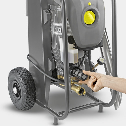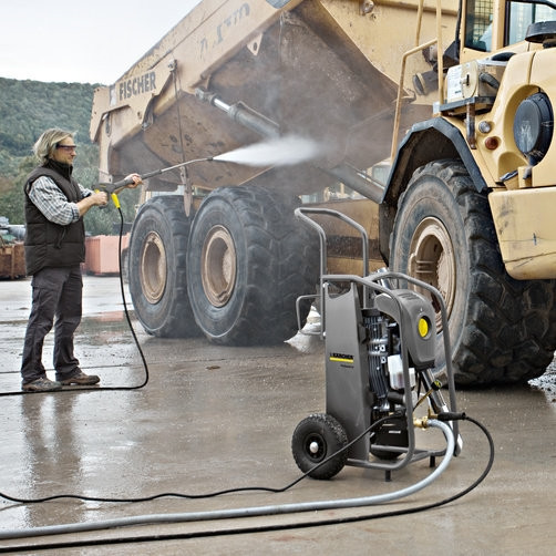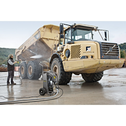Härteste Arbeitseinsätze in schwierigem Gelände, wie sie insbesondere in der Landwirtschaft, dem Baugewerbe oder im kommunalen Bereich auftreten, steckt unser unbeheizter Hochdruckreiniger HD 10/25-4 Cage Plus mühelos weg. Dafür sorgt die ausgesprochen stabile Rohrrahmenkonstruktion, die einerseits Schäden von außen wirkungsvoll verhindert und andererseits eine servicefreundliche Zugänglichkeit zu allen wichtigen Komponenten gewährleistet. Mit einem Arbeitsdruck von 250 Bar, einer Schwemmleistung von rund 1000 Litern Wasser pro Stunde und unserer innovativen Rotordüse meistert er auch die schlimmsten Verschmutzungen. Dafür, dass der Arbeitskomfort nicht zu kurz kommt, sorgen die EASY!Force-Hochdruckpistole sowie die patentierten EASY!Lock-Schnellverschlüsse: Während die EASY!Force-Hochdruckpistole die Rückstoßkraft des Hochdruckstrahls ausnutzt, um die Haltekraft auf null zu reduzieren, ermöglichen die EASY!Lock-Schnellverschlüsse ein im Vergleich zu herkömmlichen Schraubverbindungen 5-mal schnelleres Handling ohne Einbußen bei Robustheit und Langlebigkeit. Einen einfachen Transport ermöglicht eine sinnvolle Kranaufhängung direkt am Rohrrahmen.