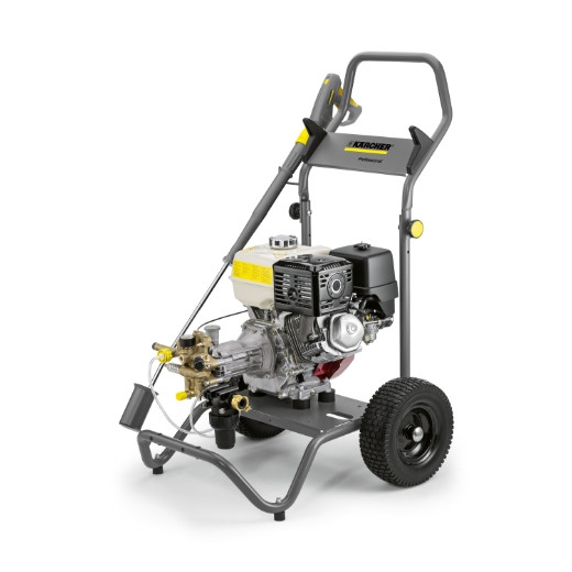 Mit einem Benzinmotor von Honda ausgestattet, arbeitet der Kaltwasser-Hochdruckreiniger HD 9/23 G völlig autonom von Stromanschlüssen. Entwickelt für beste Reinigungsergebnisse – dank eines Wasserdrucks von 230 Bar – und durch einen sehr stabilen Grundrahmen geschützt, überzeugt das Gerät auch unter extremen Bedingungen. Das ergonomische Rahmenkonzept bietet ein Maximum an Mobilität, auch bei Bodenunebenheiten. Pannensichere Räder, das gelungene Bedienkonzept und diverse Aufbewahrungsmöglichkeiten für Zubehör erhöhen genauso den Komfort wie die EASY!Force-Hochdruckpistole, die die Rückstoßkraft des Hochdruckstrahls nutzt, um damit die Haltekraft für den Anwender auf null zu reduzieren, sowie die EASY!Lock-Schnellverschlüsse, mit denen das Auf- und Abrüsten im Vergleich zu herkömmlichen Schraubverbindungen 5-mal schneller von der Hand geht. Die kräftige Pumpe erlaubt in Notfällen die Wasserentnahme aus Seen oder Teichen. Geschützt wird sie durch einen großen Wasserfilter und ein Thermoventil, das ein Überhitzen im Kreislaufbetrieb verhindert. Zusätzlich erhältlich für den HD 9/23 G sind ein Cage-Schutzrahmen mit Ösen zur Kranverladung sowie ein Anbausatz für eine Schlauchtrommel.