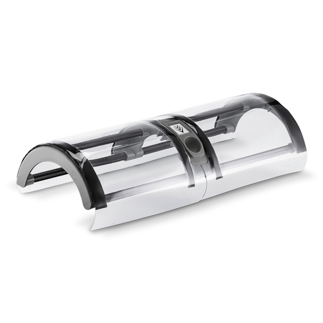 Kinderleicht direkt auf dem Antrieb der rotierenden Walzenbürste anbringbarer Spritzschutz mit transparenter Folie, die während der Arbeit jederzeit uneingeschränkte Sicht auf die Reinigungsbürste gewährt und einfach per Klettverbindung zu wechseln ist. Während der Anwender bei der Fassadenreinigung trocken bleibt, sorgt der Spritzschutz darüber hinaus für bessere Reinigungsergebnisse, da das Wasser an der Fassade abläuft und dabei Schmutzpartikel automatisch abspült.