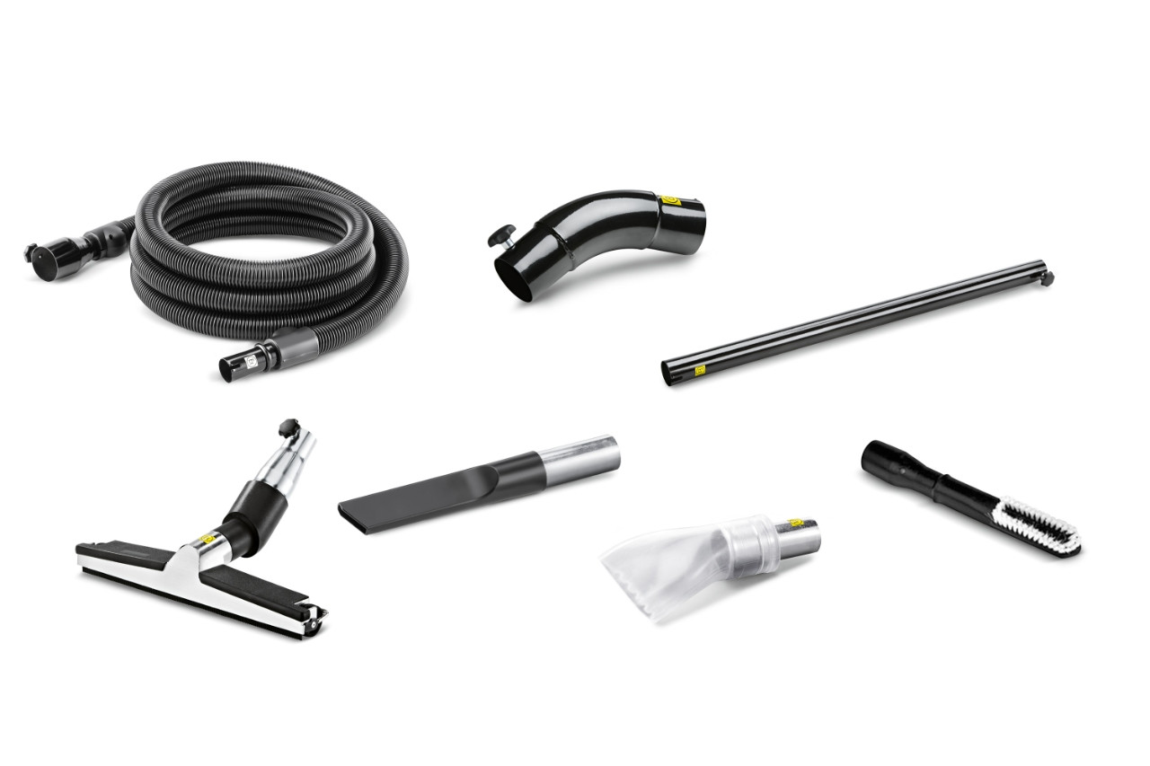 Zubehörset für Industriestaubsauger (Feststoffe und Stäube): EVA-Schlauch 3 Meter (9.988-088.0), Handgriff (9.977-679.0), Saugrohr (9.977-525.0), Bodendüse (9.989-682.0), Nutendüse (9.988-116.0), Flächendüse (9.988-118.0) und Standardbürste (9.981-432.0). DN 40.