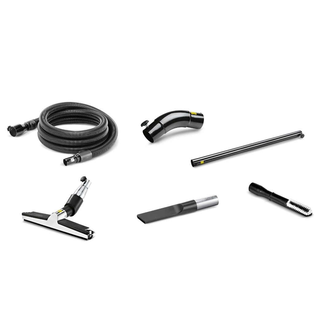 Zubehörset für Industriestaubsauger (Feststoffe und Stäube): EVA-Schlauch 3 Meter (9.988-090.0), Handgriff (9.977-678.0), Saugrohr (9.977-531.0), Bodendüse (9.987-612.0), Nutendüse (9.988-117.0) und Standardbürste (9.981-432.0).