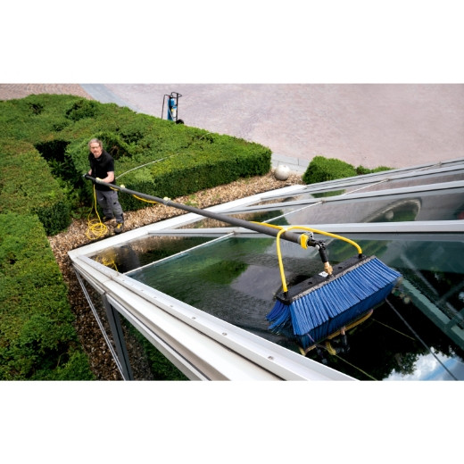 Multifunktional einsetzbare Hybrid-Teleskopstange TL 10 H mit einzigartigem Verdrehschutz für noch sichereres und ergonomischeres Arbeiten. Ihre auf bis zu 10 Meter ausfahrbare Länge ermöglicht mühelos Reinigungsarbeiten mit Osmosewasser an Fenstern, Fassaden oder Solarpanelen. Dabei ist sie sowohl zur Niederdruckreinigung mit Waschbüsten als auch – mit entsprechenden Adaptern aufgerüstet – für Hochdruckaufgaben geeignet. Sogar Sauganwendungen sind möglich. Hergestellt aus einer speziellen Carbon-Glasfaser-Mischung ist die TL 10 H gleichzeitig besonders steif und leicht. In Verbindung mit dem drehbaren Standfuß, an dem auch ein Tragegurt angebracht werden kann, den Schnellverschlüssen für einfaches Teleskopieren sowie der werkzeuglos und individuell einstellbaren Klemmkraft bietet sie dem Anwender maximalen Arbeitskomfort.