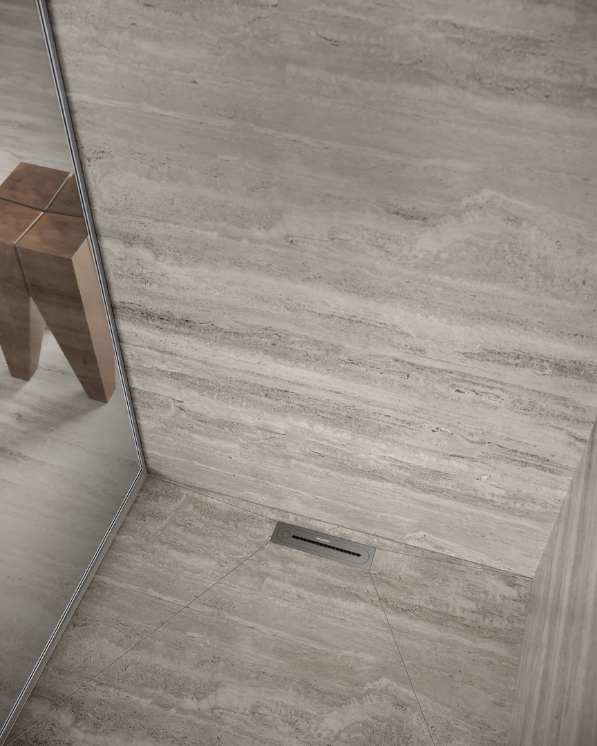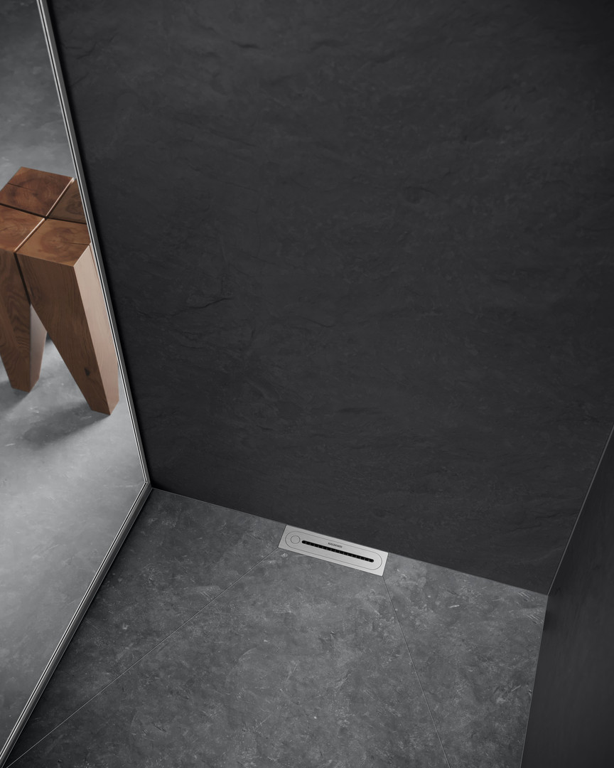 mit CLICK'n CLEAN Öffnungsmechanismus mit integriertem Haarfangsieb, positionierbar direkt vor der Wand oder mittig im Duschbereich, wandseitiger Aufbau von = 14,5 mm ± 3 mm, bodenseitiger Aufbau von 11 mm bis 28 mm, abgestimmt auf die erforderliche FLOWDRAIN HORIZONTAL Ablaufgarnituren