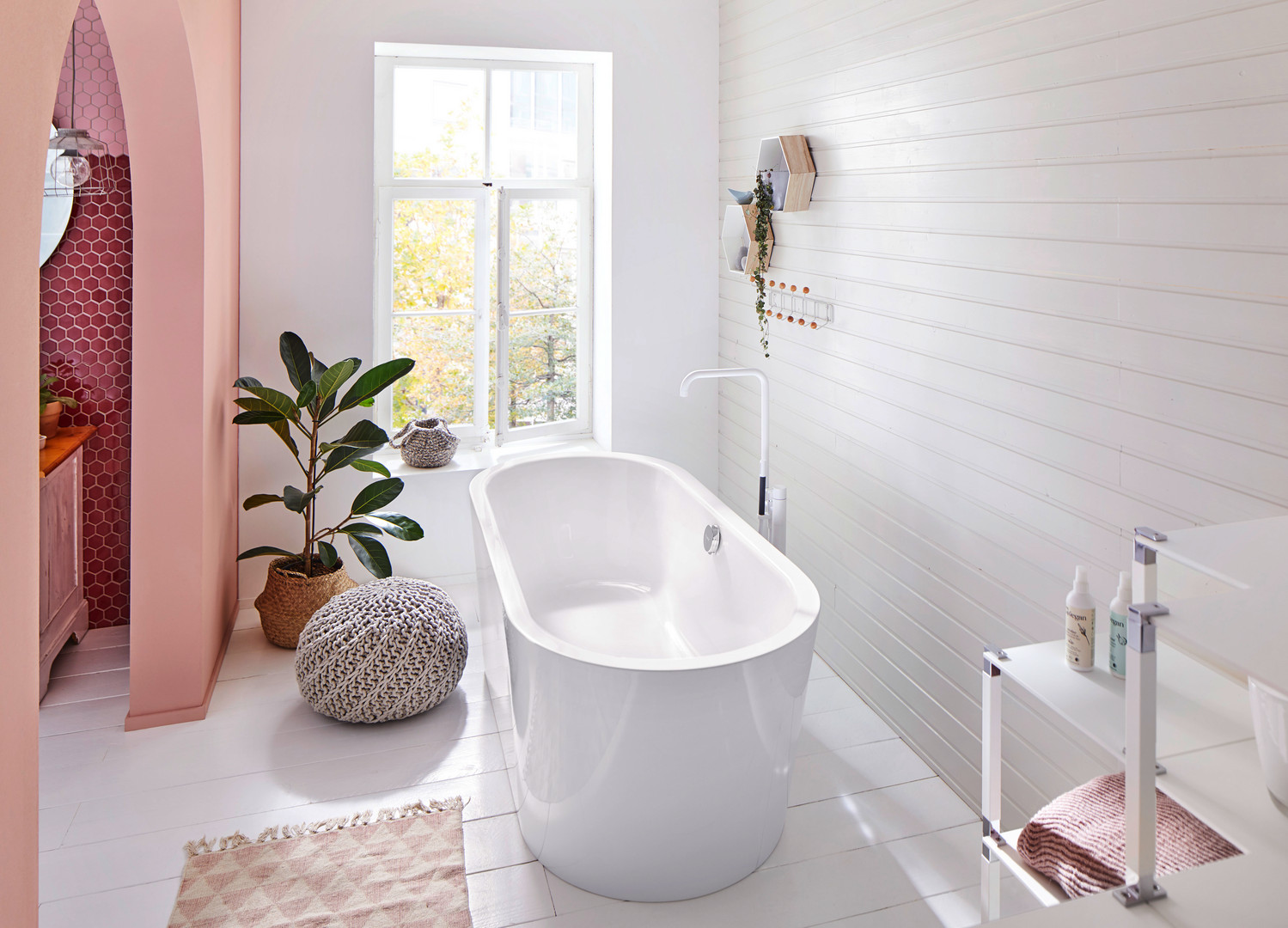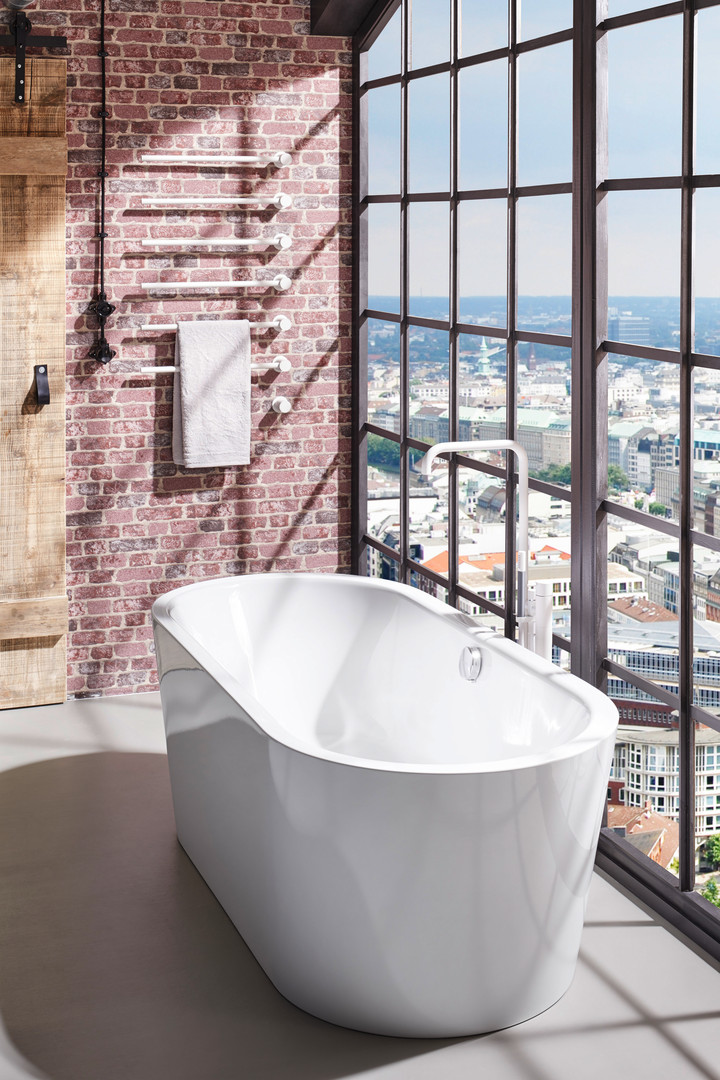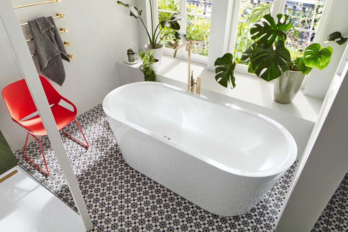 vormontierte Zulaufgarnitur, Außenform Oval, Tiefe 430 mm, Stahl-Email Badewanne, Überlaufloch Ø 52 mm, Ablaufloch Ø 52 mm, mittige Ab-/Überlaufposition, Gewicht 46 kg, Basisfarbe alpinweiß, Oberfläche pflegeleichter Perl-Effekt, zertifizierte Oberfläche kratz- und schlagfest, chemikalienresistent, hitzebeständig, UV beständig, nachhaltig, formstabil, hygienisch, Erdungslasche für Potenzialausgleich