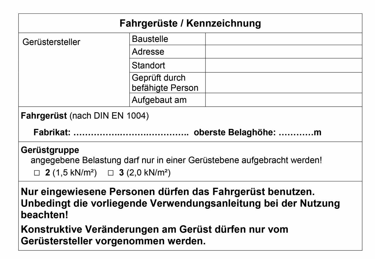 Kennzeichnungsblatt zur Kennzeichnung von FahrGerüsten mit Lieferung von