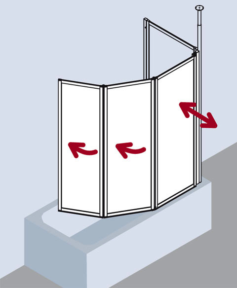 kombinierbar mit V2 TWD Seitenwand mit Deckenstütze, gerahmt, mit drei Flügeln, im Wandprofil 90° nach innen und außen schwenkbar, zweite und dritte Flügel 180° nach innen schwenkbar, Verglasung mit 3 mm Kunststoffglas Kerolan Perl oder teilweise 3 mm Einscheiben-Sicherheitsglas nach EN 12150, optional mit Pflegeleicht-Beschichtung, Profile aus eloxiertem Aluminium, Verstellmöglichkeit im Wandprofil 16 mm, durchgehende Dichtprofile, waagerechte Dichtleisten, mit Befestigungsmaterial, geprüft nach DIN EN 14428, Faltwand rechts und links verwendbar