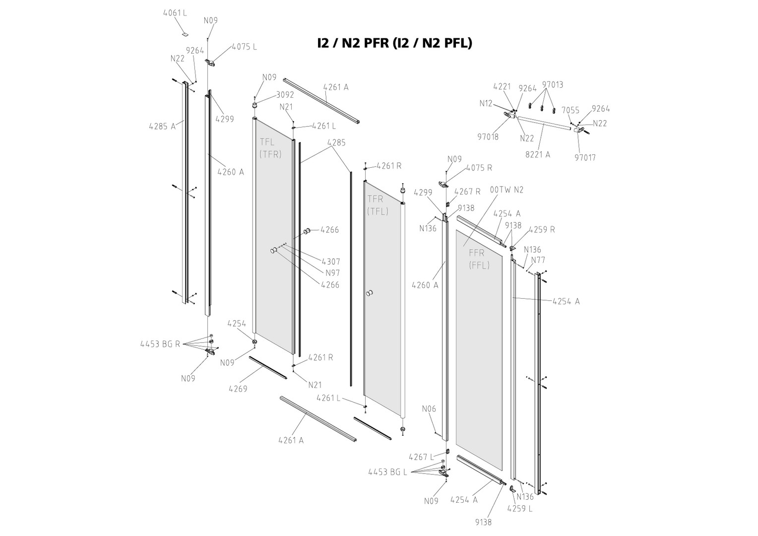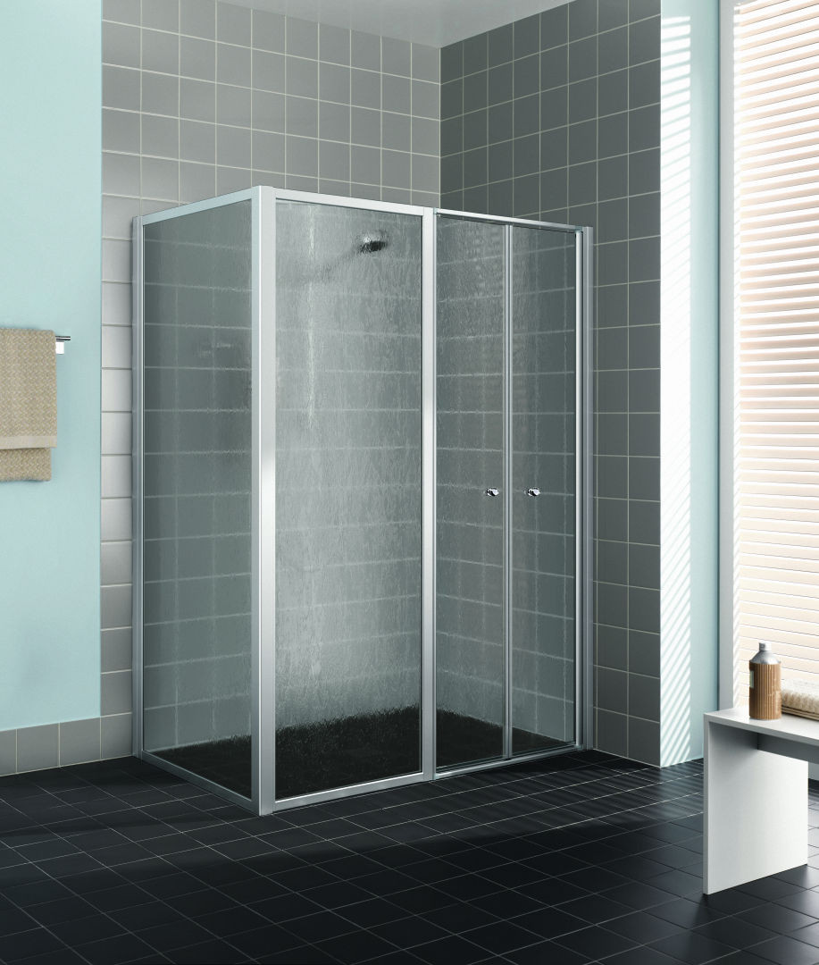 zum Einbau in einer Nische und kombinierbar mit Nova 2000 Seitenwänden, teilgerahmt, mit zwei Türflügeln, nach innen und außen öffnend, einem Festfeld, Stabilisierung (innen), mit Zugstab, Verglasung Festfeld 3 mm, Pendeltür 4 mm Kunststoffglas Kerolan Fontana, Profile aus eloxiertem Aluminium, Griffe aus Kunststoff, Verstellmöglichkeit je Wandprofil 17,5 mm, Türprofile mit Hebe-Senk-Mechanismus, durchgehende Magnetleisten und Dichtprofile, Bodenschwelle (Höhe 16 mm), Installation immer mit Bodenschwelle, mit Befestigungsmaterial, geprüft nach DIN EN 14428, Schräge waagerecht max. 5 mm