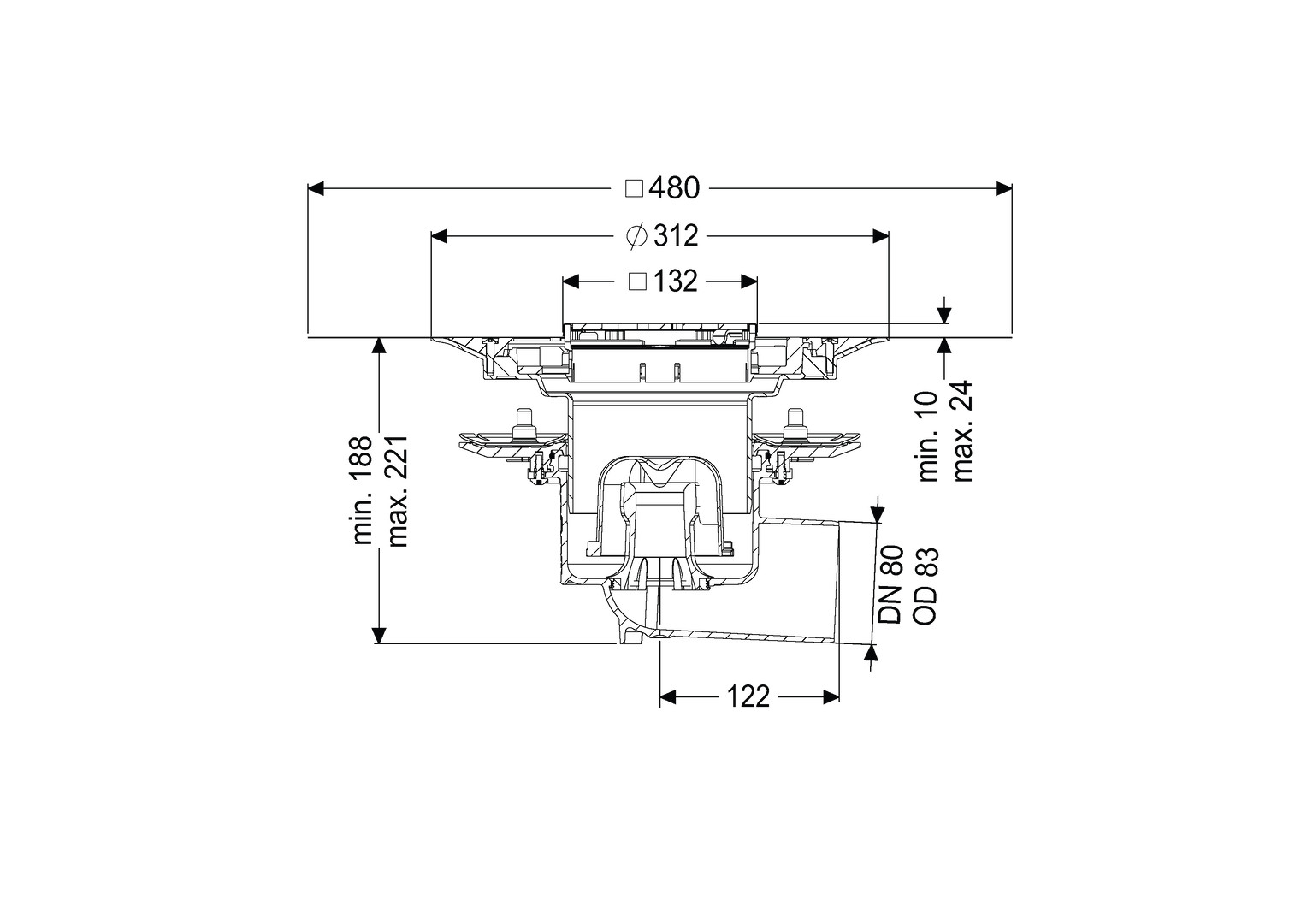 Kessel Bodenablauf Ecoguss DN/DA 80/83, 134 x 108 mm, Grundkörper, Aufsatzstück mit Designrost