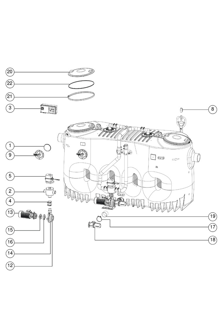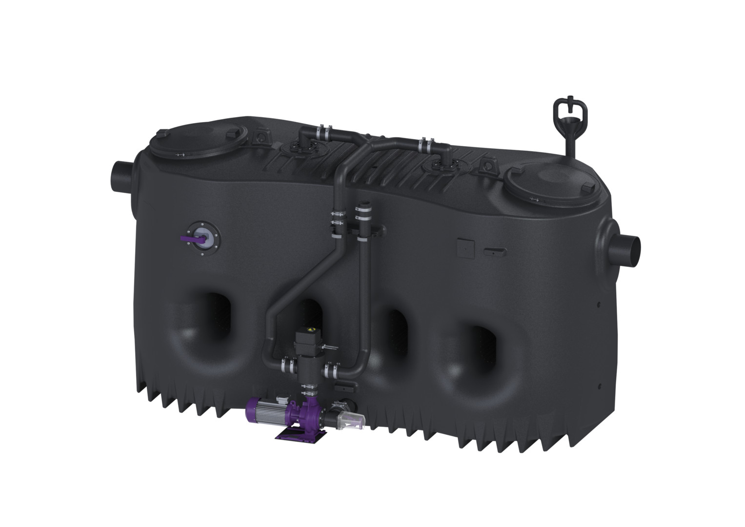 aus PE, Einbau in frostgeschützten Räumen, mit programmgesteuerter Entsorgungs- und Reinigungseinrichtung, Schredder-Mix-System, Schaltgerät, Schauglas, Fülleinrichtung, Pumpe und Trinkwasserspülung, die Fließrichtung kann durch Austauschen des Zu- und Ablaufstutzens geändert werden, Pumpenleistung 3 kW, Kabellänge für Anbauteile 5 m, Anlage komplett montiert, Zubehör Probeentnahmeeinrichtung, Hebeanlagen, Fernbedienung