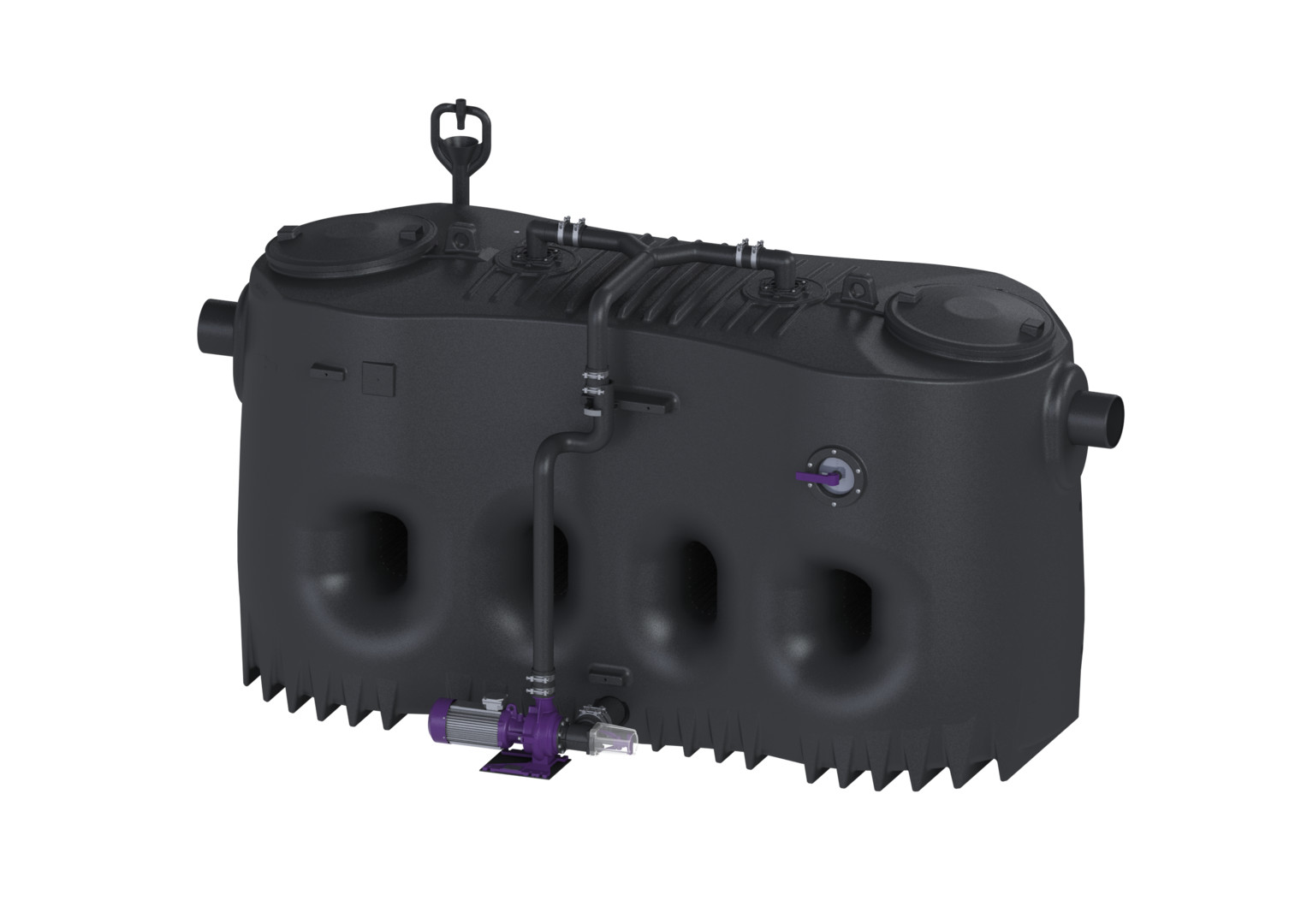 aus PE, Einbau in frostgeschützten Räumen, mit Direktentsorgung, programmgesteuertem Schredder-Mix-System, Schaltgerät, Schauglas, Fülleinrichtung und Pumpe, die Fließrichtung kann durch Austauschen des Zu- und Ablaufstutzens geändert werden, Pumpenleistung 3 kW, Kabellänge für Anbauteile 5 m, Anlage komplett montiert, Zubehör Probenahmeeinrichtung, Hebeanlagen, Fernbedienung