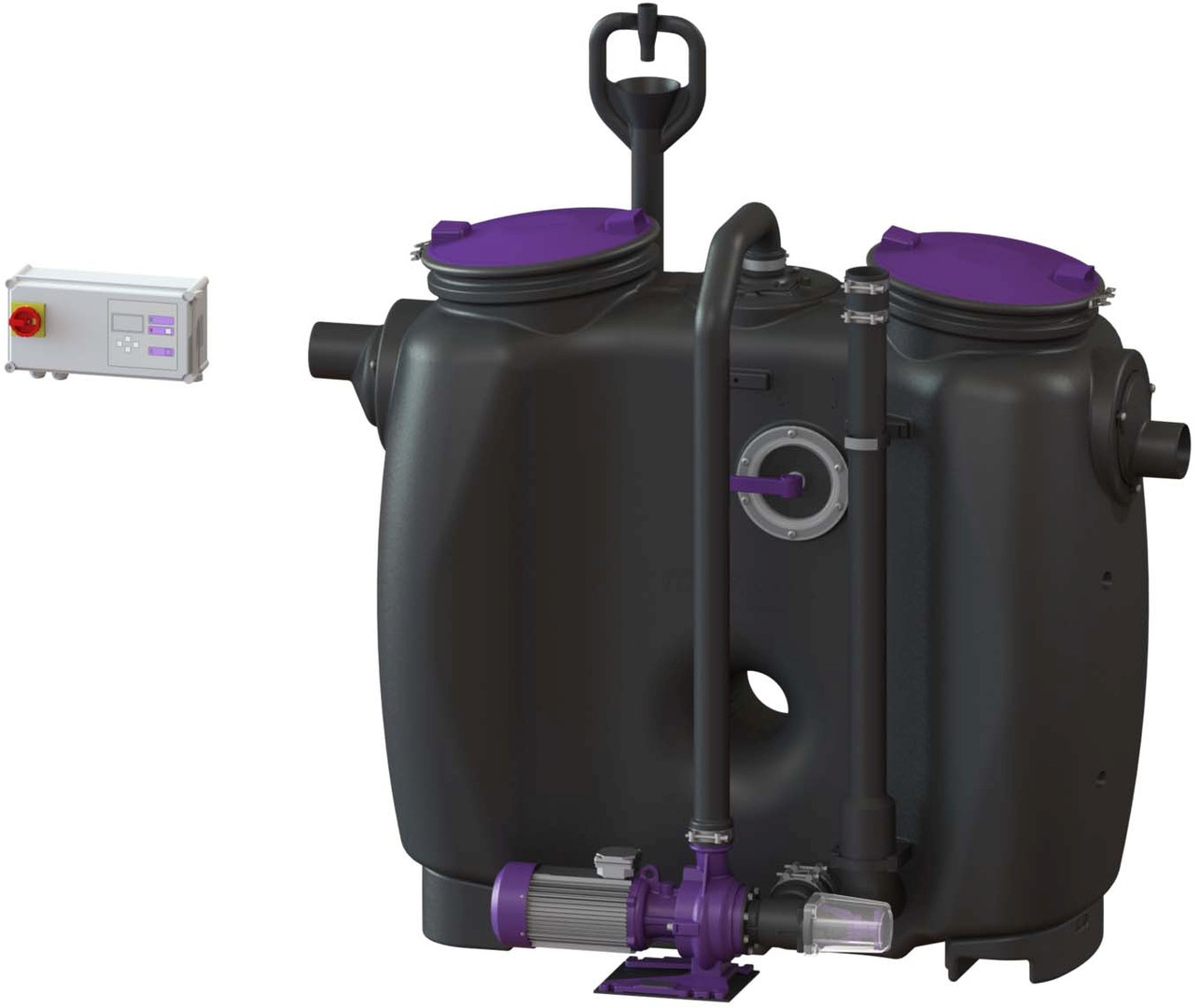 aus PE, Einbau in frostgeschützten Räumen, mit Direktentsorgung, programmgesteuertem Schredder-Mix-System, Schaltgerät, Schauglas, Fülleinrichtung und Pumpe, die Fließrichtung kann durch Austauschen des Zu- und Ablaufstutzens geändert werden, Pumpenleistung 3 kW, Kabellänge für Anbauteile 5 m, Anlage komplett montiert, Zubehör Probenahmeeinrichtung, Hebeanlagen, Fernbedienung