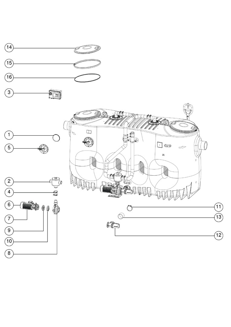 aus PE, Einbau in frostgeschützten Räumen, mit manueller Entsorgungs- und Reinigungseinrichtung, Schredder-Mix-System, Schaltgerät, Schauglas, Fülleinrichtung und Pumpe, die Fließrichtung kann durch Austauschen des Zu- und Ablaufstutzens geändert werden, Pumpenleistung 3 kW, Kabellänge für Anbauteile 5 m, Anlage komplett montiert, Zubehör Probenahmeeinrichtung, Hebeanlagen