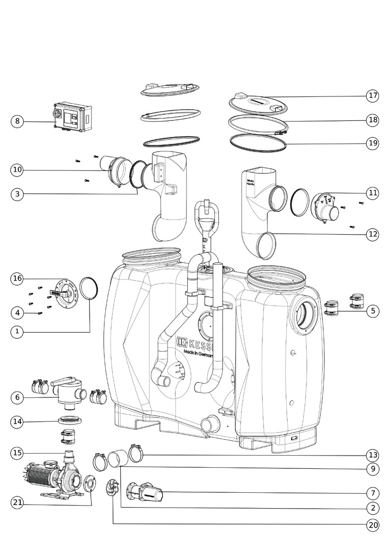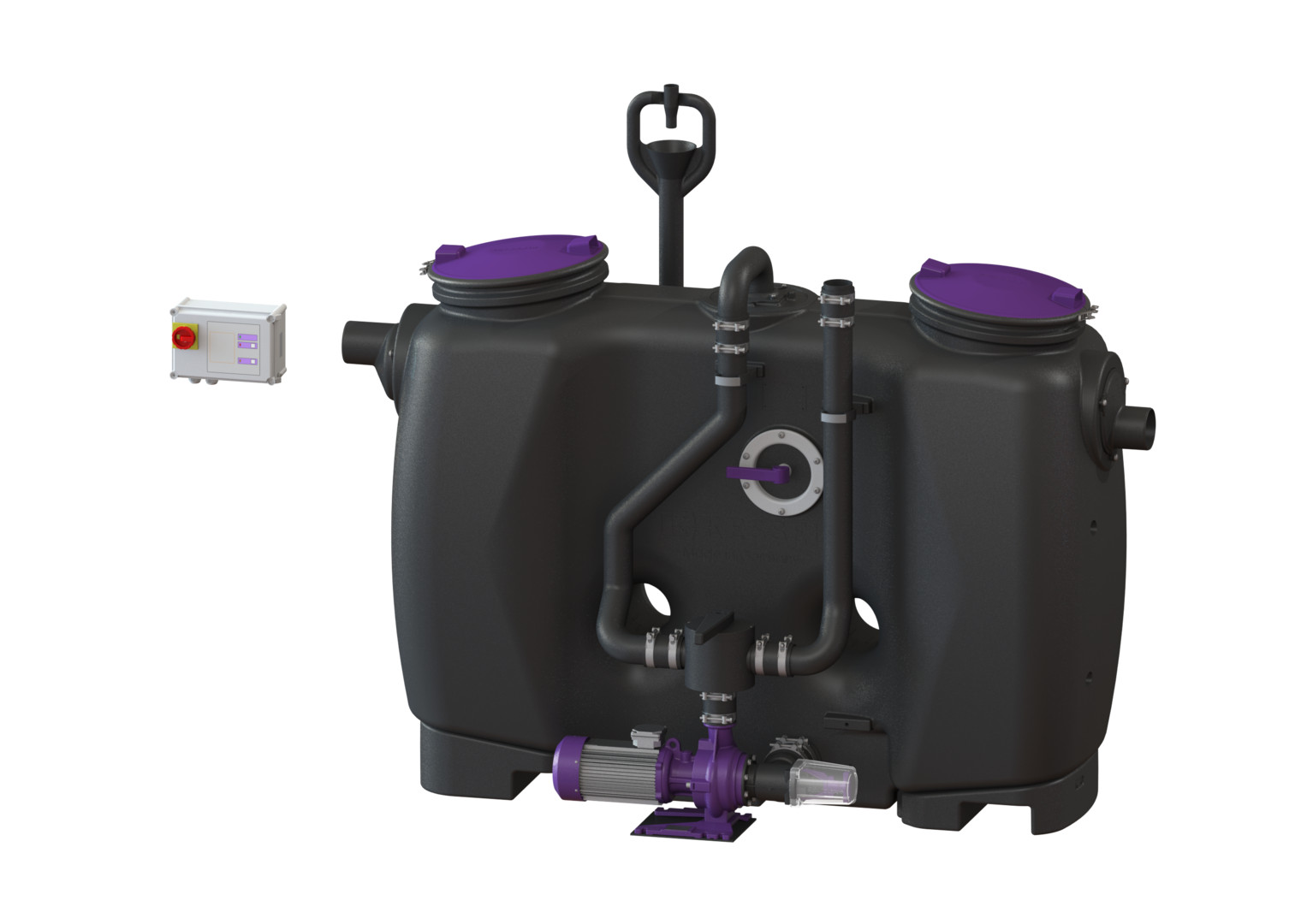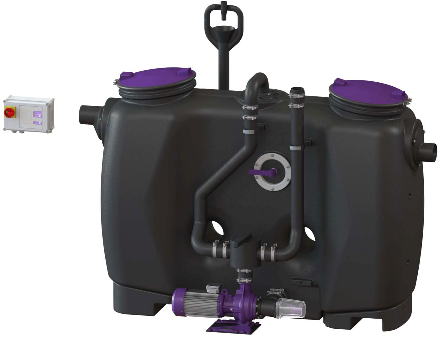 aus PE, Einbau in frostgeschützten Räumen, mit manueller Entsorgungs- und Reinigungseinrichtung, Schredder-Mix-System, Schaltgerät, Schauglas, Fülleinrichtung und Pumpe, die Fließrichtung kann durch Austauschen des Zu- und Ablaufstutzens geändert werden, Pumpenleistung 3 kW, Kabellänge für Anbauteile 5 m, Anlage komplett montiert, Zubehör Probenahmeeinrichtung, Hebeanlagen