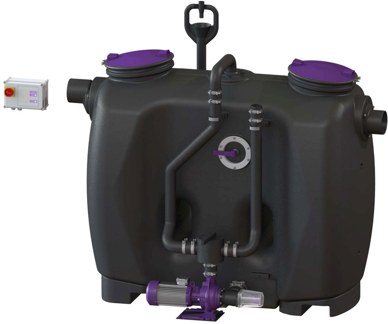 aus PE, Einbau in frostgeschützten Räumen, mit manueller Entsorgungs- und Reinigungseinrichtung, Schredder-Mix-System, Schaltgerät, Schauglas, Fülleinrichtung und Pumpe, die Fließrichtung kann durch Austauschen des Zu- und Ablaufstutzens geändert werden, Pumpenleistung 3 kW, Kabellänge für Anbauteile 5 m, Anlage komplett montiert, Zubehör Probenahmeeinrichtung, Hebeanlagen