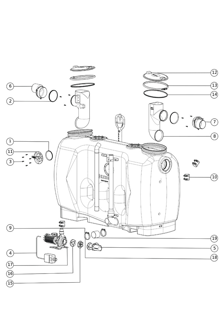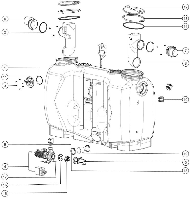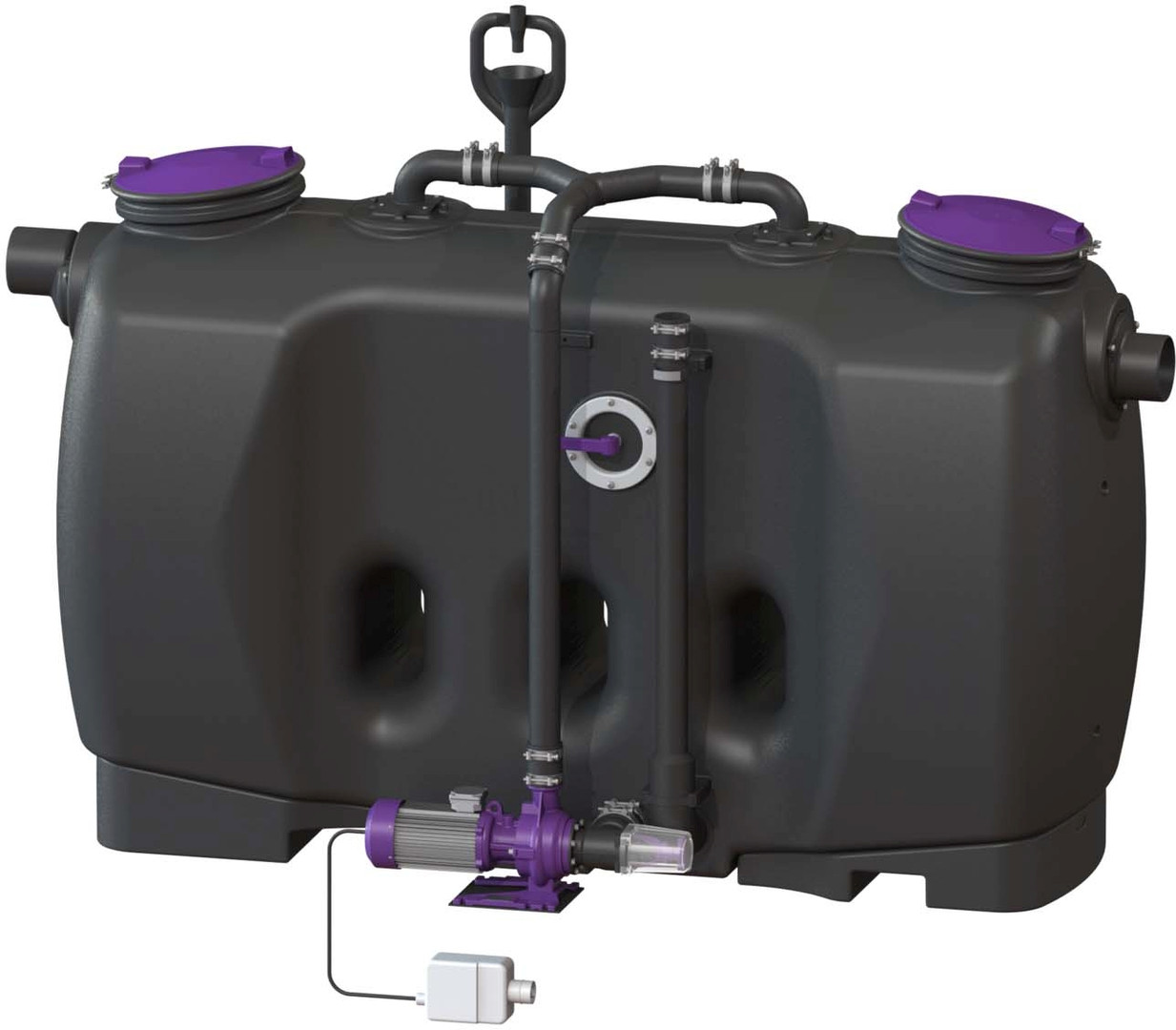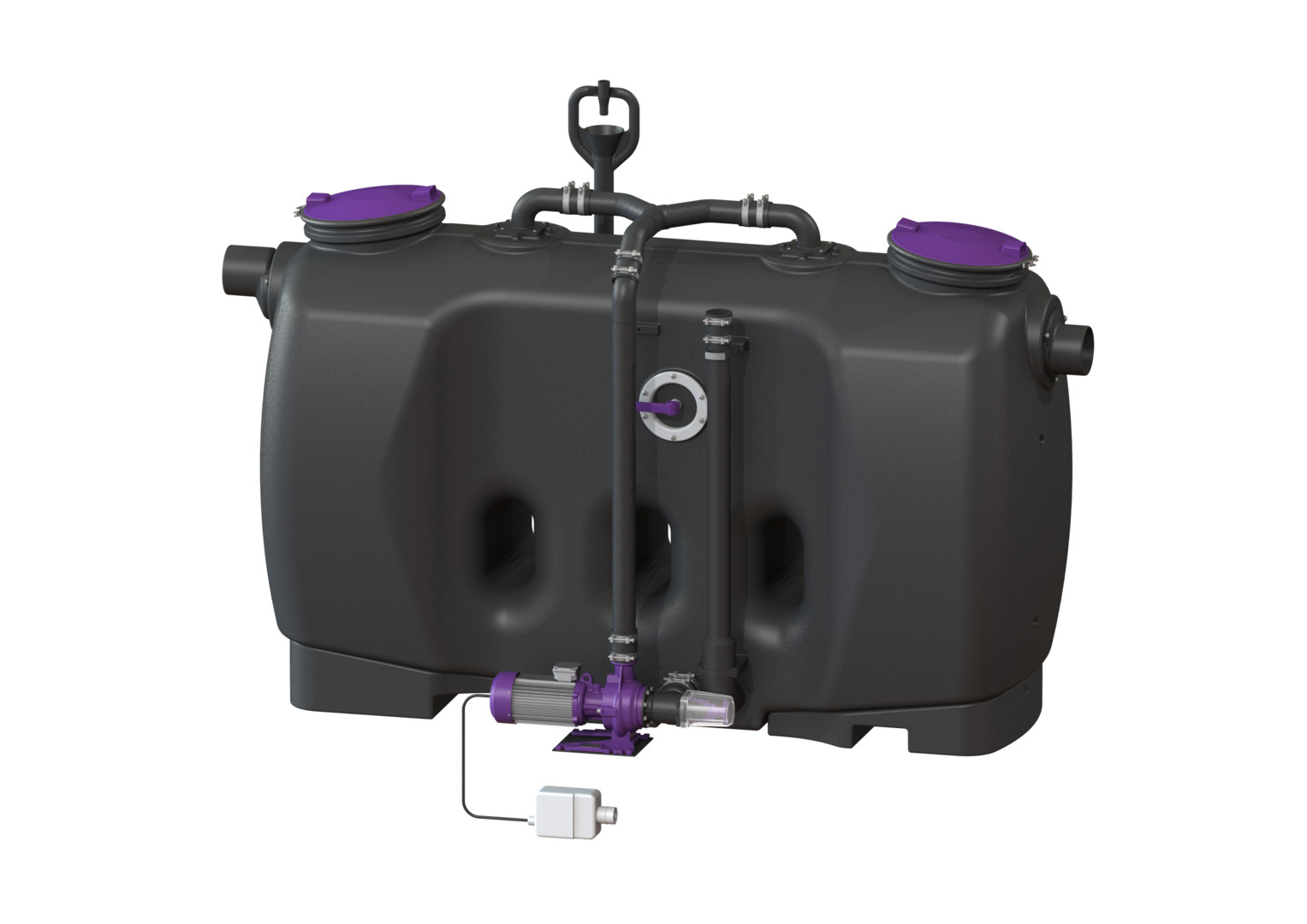 aus PE, Einbau in frostgeschützten Räumen, mit Direktentsorgung, Schredder-Mix-System, mit/ohne Schauglas, Fülleinrichtung, Pumpe, die Fließrichtung kann durch Austauschen des Zu- und Ablaufstutzens geändert werden, Pumpenleistung 3 kW, Kabellänge für Anbauteile 5 m, Anlage komplett montiert, Zubehör Probenahmeeinrichtung, Hebeanlagen, Schauglas