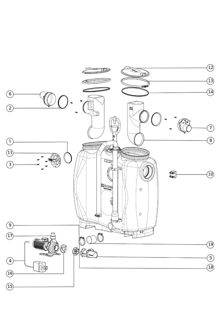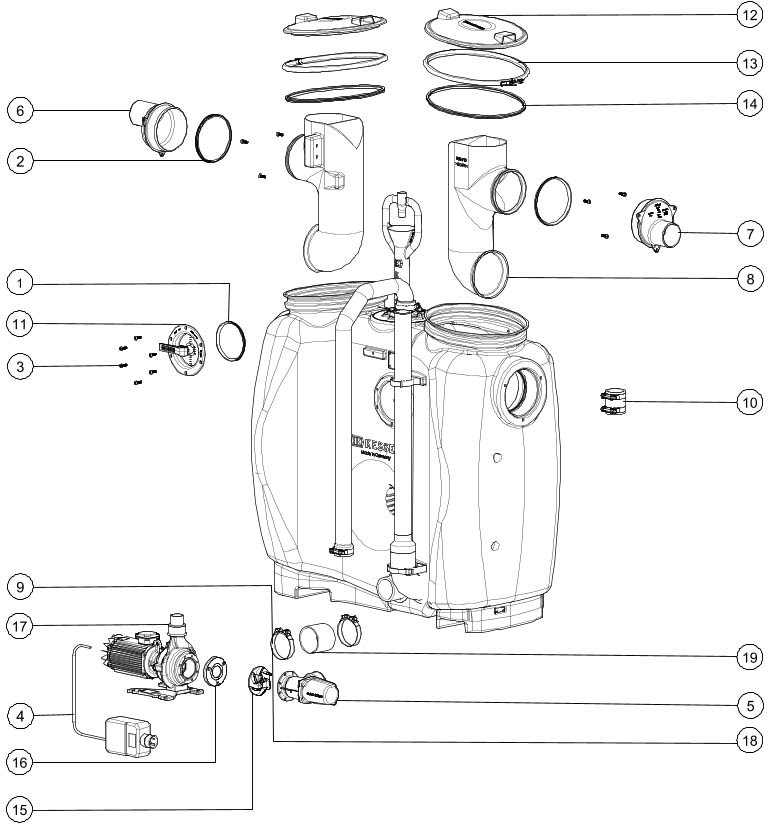 aus PE, Einbau in frostgeschützten Räumen, mit Direktentsorgung, Schredder-Mix-System, mit/ohne Schauglas, Fülleinrichtung, Pumpe, die Fließrichtung kann durch Austauschen des Zu- und Ablaufstutzens geändert werden, Pumpenleistung 3 kW, Kabellänge für Anbauteile 5 m, Anlage komplett montiert, Zubehör Probenahmeeinrichtung, Hebeanlagen, Schauglas