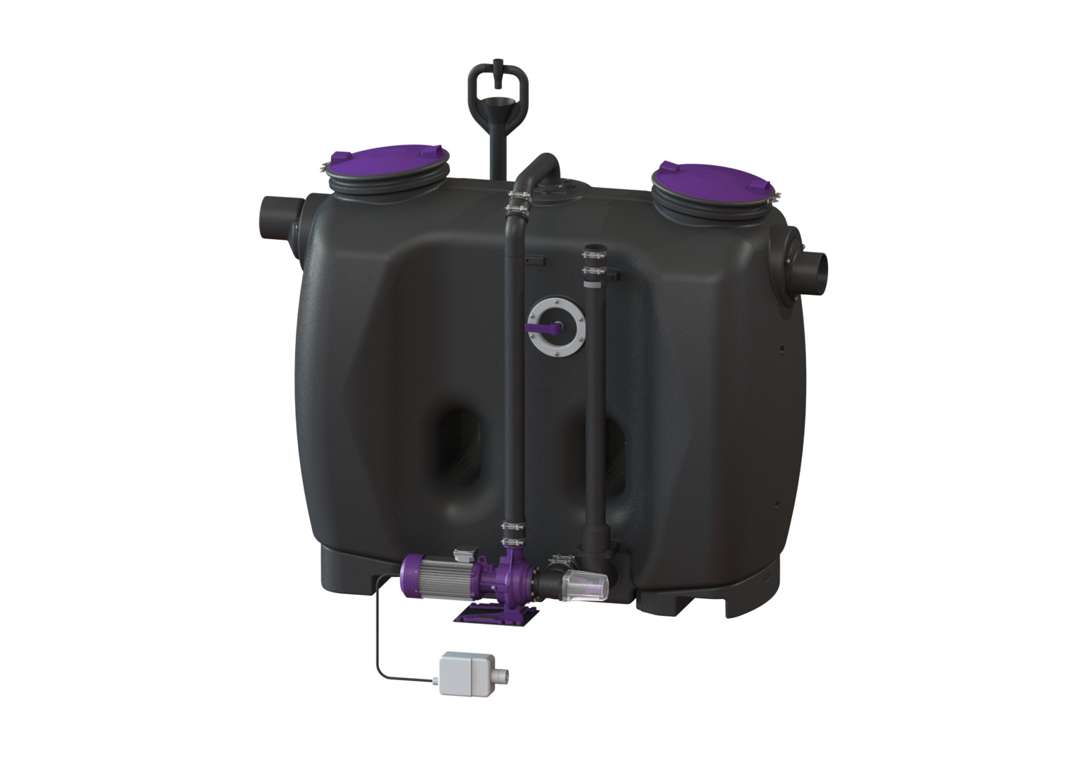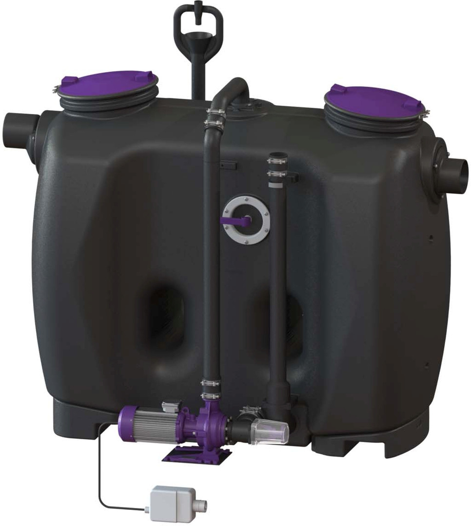 aus PE, Einbau in frostgeschützten Räumen, mit Direktentsorgung, Schredder-Mix-System, mit/ohne Schauglas, Fülleinrichtung, Pumpe, die Fließrichtung kann durch Austauschen des Zu- und Ablaufstutzens geändert werden, Pumpenleistung 3 kW, Kabellänge für Anbauteile 5 m, Anlage komplett montiert, Zubehör Probenahmeeinrichtung, Hebeanlagen, Schauglas