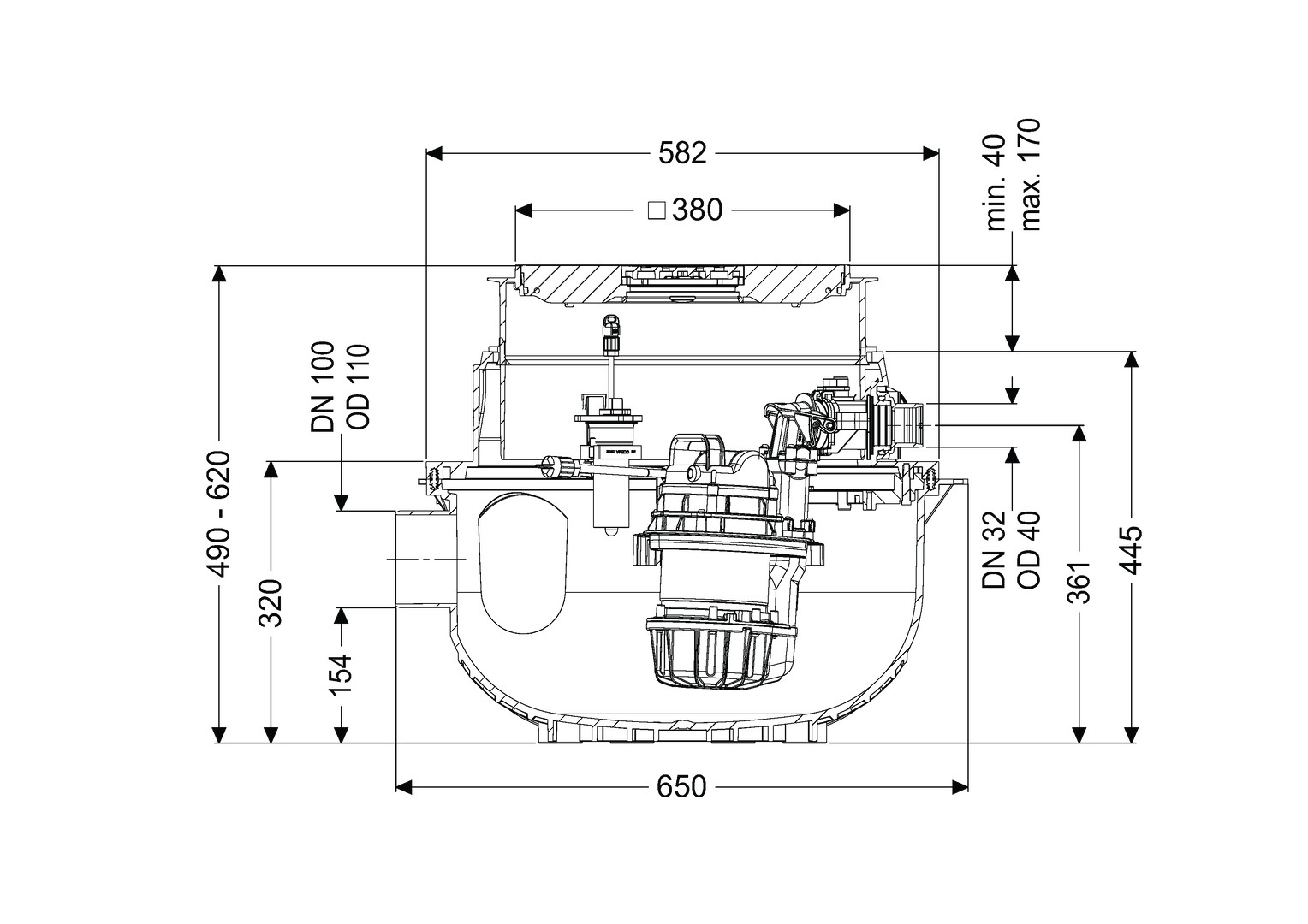 zum Einbau in die Bodenplatte, Kunststoff, mit Freistromrad, Pumpe Typ GTF, mit pneumatische Niveauerfassung, entnehmbar, Comfort-Schaltgerät, Display, USB-Schnittstelle und Selbstdiagnosesystem SDS, Anlage steckerfertig, Stutzen für Zulauf und Kabelleerrohr, teleskopisches Aufsatzstück mit integrierter Ablauffunktion und Flansch für Abdichtung im Verbund, Druckleitung DN 32/OD 40, Pumpe GTF 500 Behältervolumen 65 l, Nutzvolumen 20 l, Fördermenge max. 10 cbm/h, Förderhöhe max. 8 m, Pumpe GTF 1200 Behältervolumen 65 l, Nutzvolumen 20 l, Fördermenge max. 15,5 cbm/h, Förderhöhe max. 9 m, Pumpe GTF 500 resistant beständig gegen salzhaltige Medien, Abwasser aus Enthärtungsanlagen sowie kondensathaltiges Abwasser aus Heizungsanlagen, Klasse K 3, Kabellänge 5 m, Einbautiefe 490-620 mm, Aussparungsmaße 700 × 700 mm