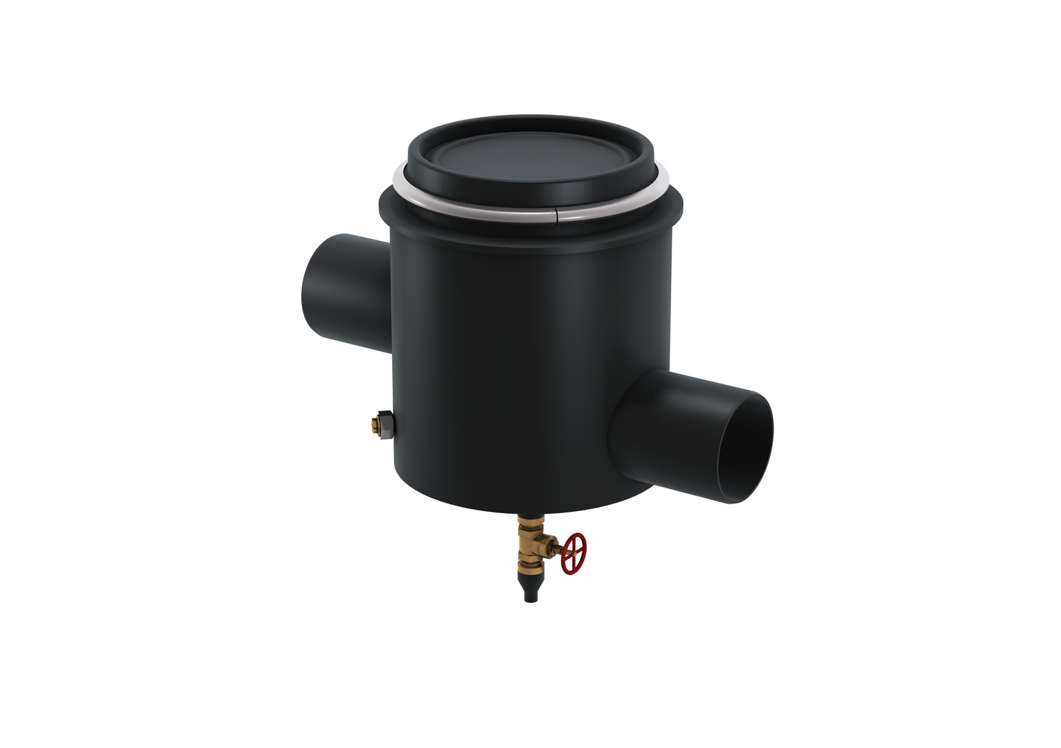 Ø 400 mm, aus Kunststoff, zum Anschluss an die Ableitung von Abscheideranlagen, leerlaufend, mit Deckel mit Drehverschluss geruchsdicht verschlossen, Reinigungsöffnung mit trichterförmigem Schlammaustrag, Absperrhahn, IG-Muffe 3/4", Absturzhöhe 120 mm