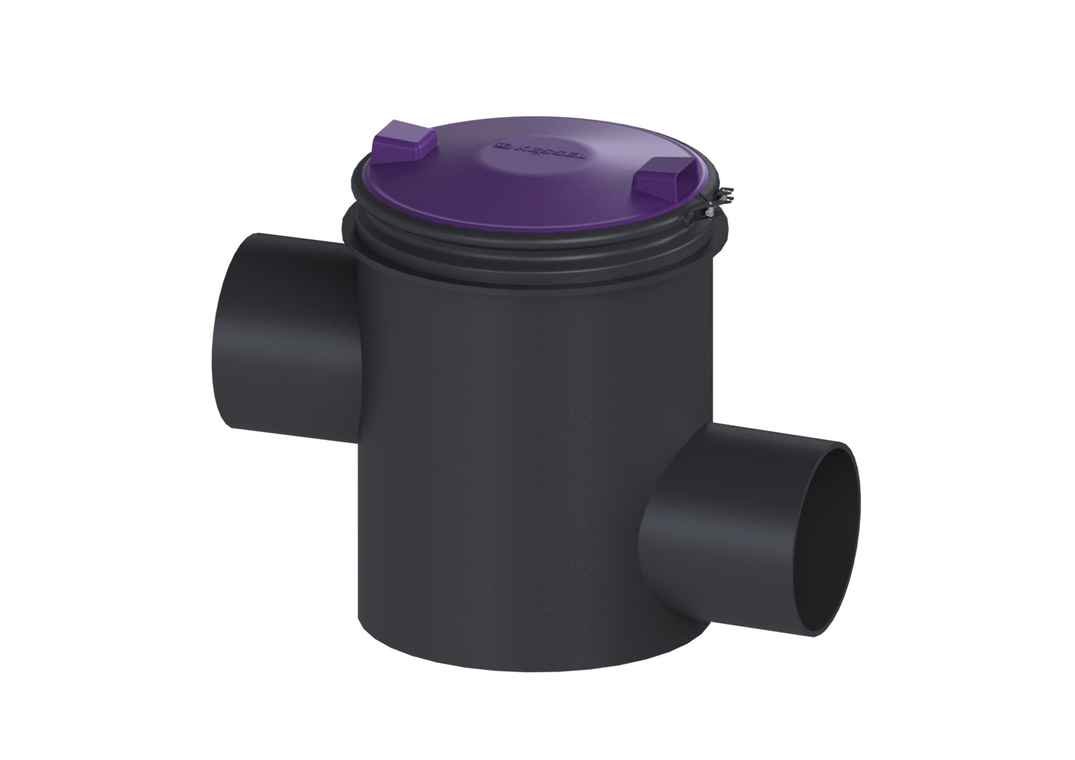 aus Kunststoff, zum Anschluss an die Ableitung von Abscheideanlagen, leerlaufend, Zu- und Auslauf DN 100/150 frei wählbar für Kunststoff-Rohre aus PE-HD (nach DIN 19537), PVC-HT, PP oder AS, mit Deckel mit Schnellspannverschluss geruchsdicht verschlossen, Absturzhöhe 120 mm