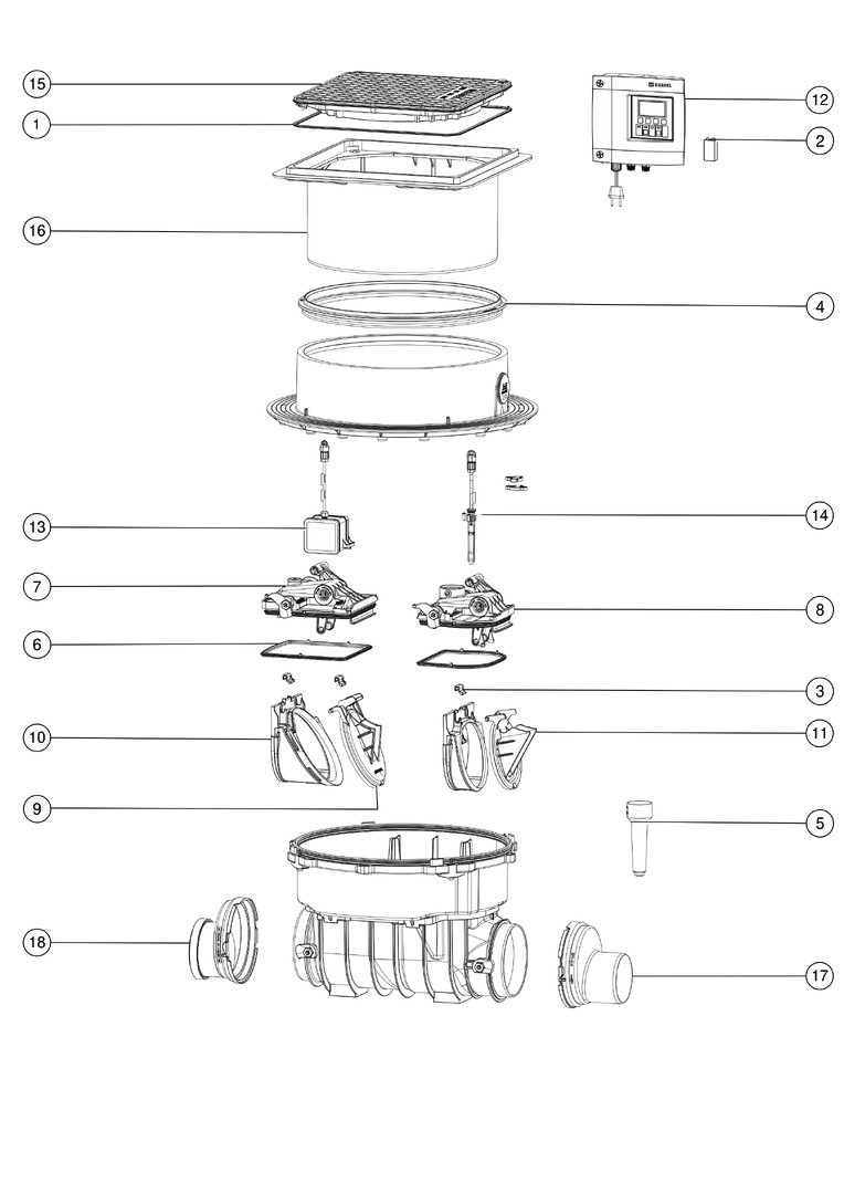 mit Zu-/Auslaufstutzen, Comfort-Schaltgerät mit Displayanzeige für Betriebszustand und Wartungshinweis, Anlage steckerfertig, teleskopisches Aufsatzstück und Flansch für Abdichtung im Verbund, Abdeckung befliesbar oder schwarz, Kabellänge 5 m, Einbautiefe 516-669 mm, Aussparungsmaße 750 x 750 mm, potentialfreier Kontakt als Anschlussoption an Gebäudeleittechnik (optional), Einbau in die Bodenplatte, Zu-/Auslauf DN 200 Hydraulik entspricht DN 150