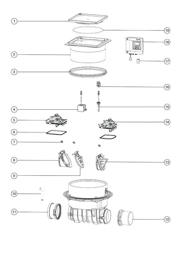 mit Zu-/Auslaufstutzen, Comfort-Schaltgerät mit Displayanzeige für Betriebszustand und Wartungshinweis, Anlage steckerfertig, teleskopisches Aufsatzstück und Flansch für Abdichtung im Verbund, Abdeckung befliesbar oder schwarz, Kabellänge 5 m, Einbautiefe 516-669 mm, Aussparungsmaße 750 x 750 mm, potentialfreier Kontakt als Anschlussoption an Gebäudeleittechnik (optional), Einbau in die Bodenplatte, Zu-/Auslauf DN 200 Hydraulik entspricht DN 150