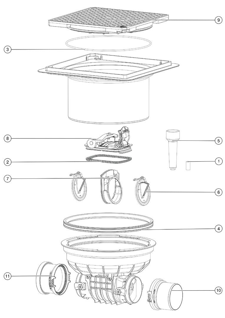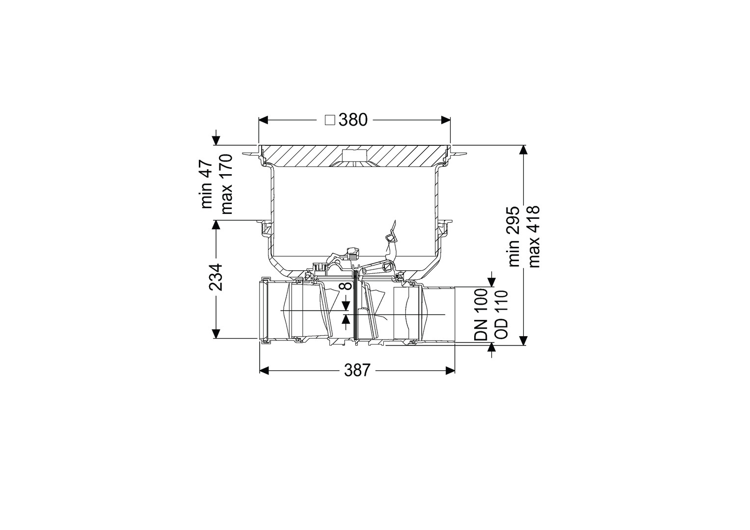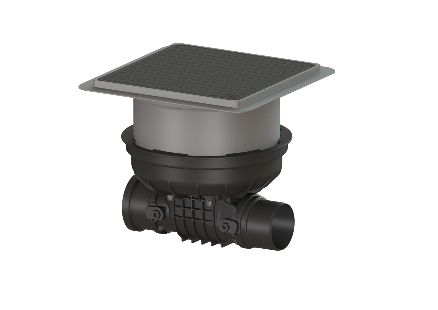 mit 2 Kunststoffklappen, Einbau in die Bodenplatte, teleskopischem Aufsatzstück und Flansch für Abdichtung im Verbund, Einbautiefe DN 90-100 276-399 mm, Einbautiefe DN 125-200 328-450 mm, Aussparungsmaße 750 x 750 mm, Zu-/Auslauf DN 200 Hydraulik entspricht DN 150