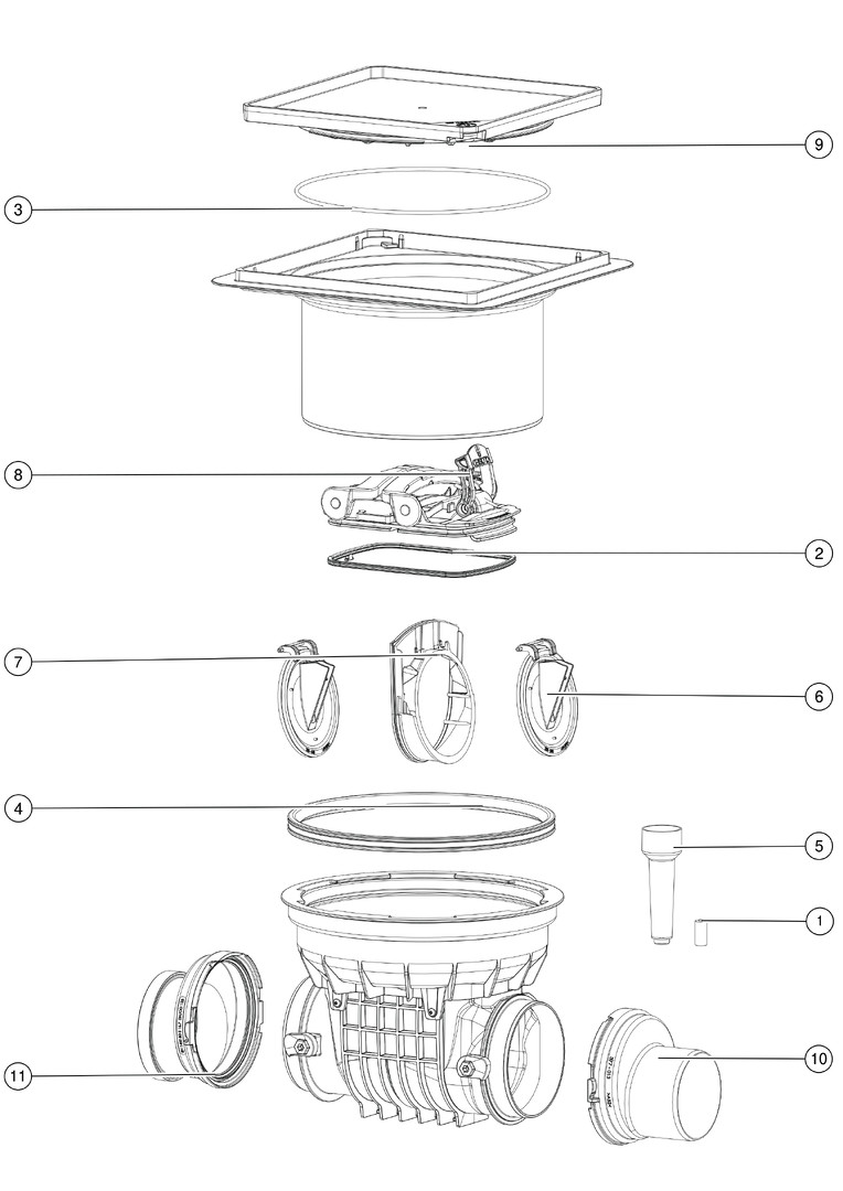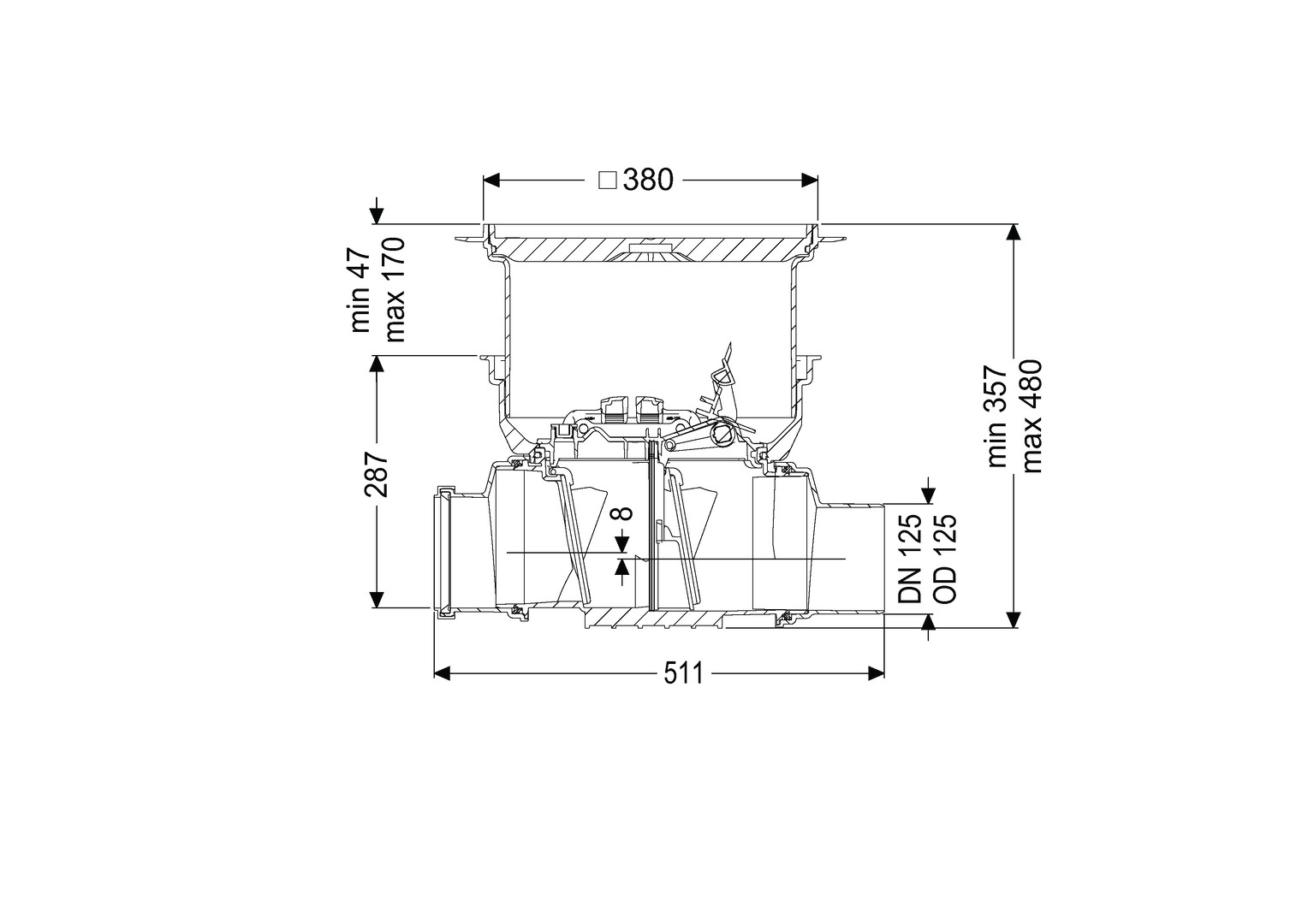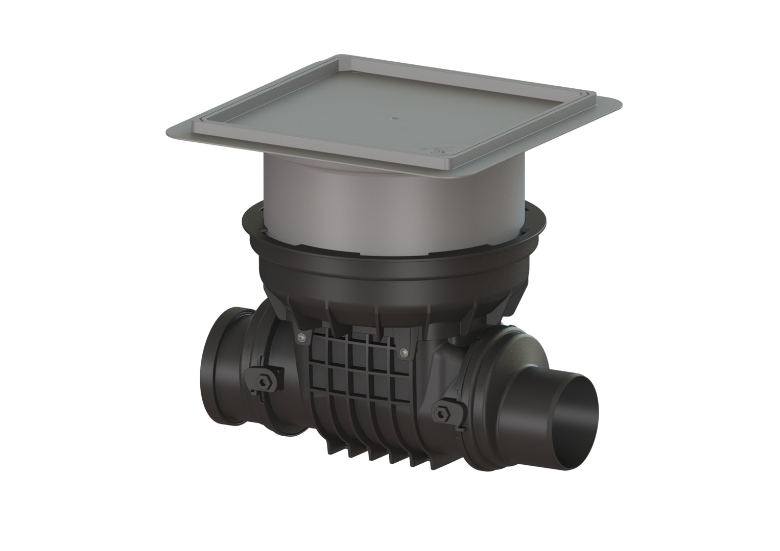 mit 2 Kunststoffklappen, Einbau in die Bodenplatte, teleskopischem Aufsatzstück und Flansch für Abdichtung im Verbund, Einbautiefe DN 90-100 276-399 mm, Einbautiefe DN 125-200 328-450 mm, Aussparungsmaße 750 x 750 mm, Zu-/Auslauf DN 200 Hydraulik entspricht DN 150