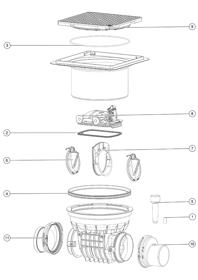 mit 2 Kunststoffklappen, Einbau in die Bodenplatte, teleskopischem Aufsatzstück und Flansch für Abdichtung im Verbund, Einbautiefe DN 90-100 276-399 mm, Einbautiefe DN 125-200 328-450 mm, Aussparungsmaße 750 x 750 mm, Zu-/Auslauf DN 200 Hydraulik entspricht DN 150
